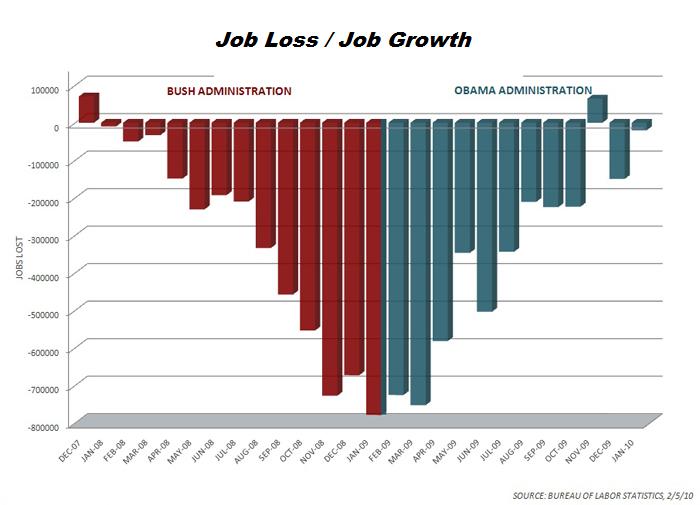 the graph states "job lost" on the Bush Side then / "job growth" on the Obama side....the graph is for "job loss" and during the down turn the loss was greatest and eventually you start to run out of jobs to lose...there is no "job growth" represented by the graph, only fewer jobs lost per month(with the exception of 1 month) on the Obama side...this is very disingenuous...the jobs lost per month on the JoBama side are in addition to the jobs lost previously, not an increase in the number of jobs "job growth"...but a glance at the graph would make you think (if you are the Hopey Change type)there's an increase in employment "job growth" and things are on the upswing...we're just shedding jobs at a slower rate....