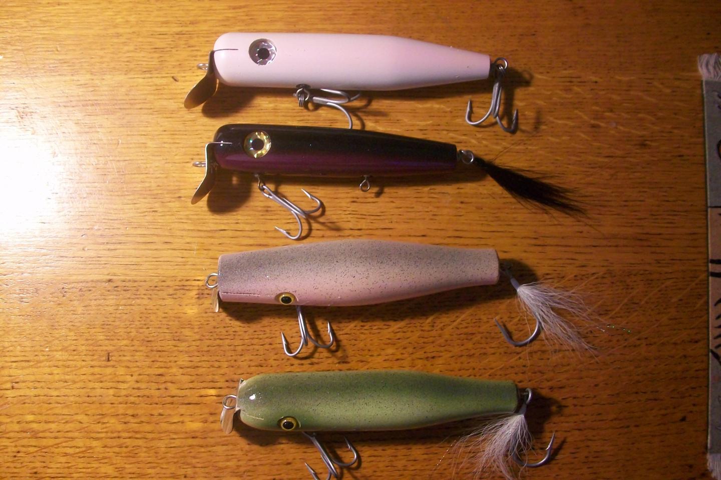 And these. Also, in looking at the whitey, I can see that I brought it with me last year for a trip. I has pointers, and minimal oxidation on the hooks. That said, it still looks good. The other three are brand spanking. It's the Tattoo small swimmer in blurp, and two Hahn's, a danny and an Atom style.