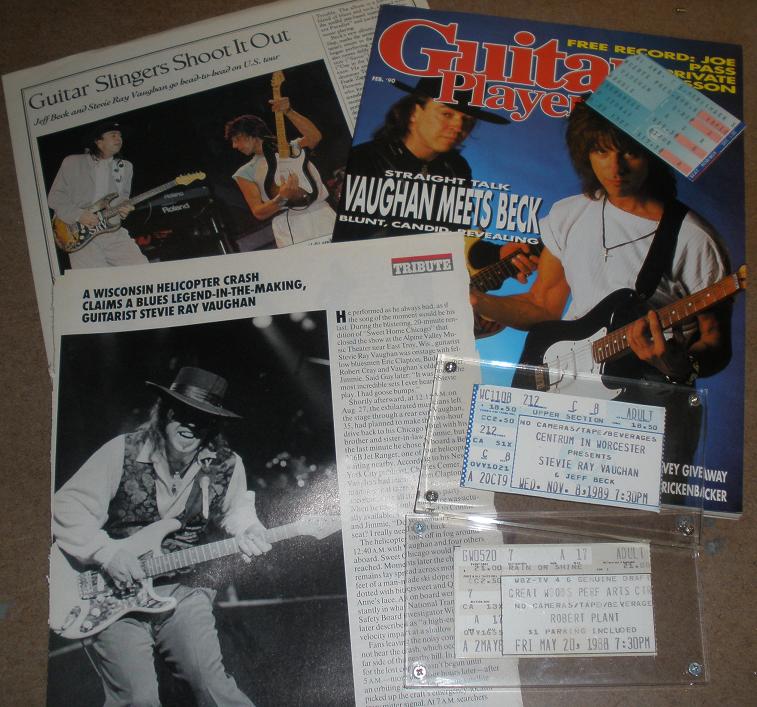 I can't believe how fast 20 years can go by......but Stevie Ray Vaughn left us just this week 20 years ago when his helicopter crashed on a mountain side following a show in Troy Wisconsin in which he appeared with his brother Jimmie, Eric Clapton, Robert Cray, Buddy Guy and others. I remember thinking how I wished I could see that show which featured all my favorite blues players on one stage. SRV being my favorite. I awoke the morning after the last show to scattered radio reports that a helicopter carrying some of the musicians from the show had crashed on a fog shrouded mountain side.......reports were sketchy and varied about who was on that helicopter and they ranged from Eric Clapton and SRV to Eric Clapton and his entourage to SRV, Clapton and Robert Cray. In the end it was SRV and a few people from Eric Claptons management group who perished. I was devastated with the news that SRV had been killed at the young age of 35 years and now just as then I can't help wondering.....what would have been? The music we missed out on due to the untimely death of a still rising star. The ticket you see in the upper right hand corner of the picture is my ticket stub from the first time I ever saw SRV play live! I waited since 4:00am at the Sears in Braintree for the ticket agency to open so I could get 4 seats for me and my buddies to go see him.......10th row center on the floor at Lowell Memorial Auditorium.....a small, intimate venue. His performance was "Jaw Dropping" to say the least. We left that show different than when we went in. Such control, such power......and so much talent. I saw him play live 6-8 times before his death. Once he opened for Robert Plant at Great Woods (ticket stub middle in picture) that was a great show but because he was the opening act I was disappointed he did not play longer than his 45 minutes. The ticket stub in the middle of the picture was from the last time I saw him play. He was teamed up with Jeff Beck. SRV was promoting his "In Step" album and Beck his "Guitar Shop" album and this was quite possibly the best show I had seen.....they were both amazing! They finished the show with a Howling Wolf song called "Goin' Down" (a recording you can hear from SRV's boxed set). They both traded riffs and solos on this last song......SRV broke a string midway through and continued without missing a beat twirling the guitar behind his neck, behind his back....just amazing! Best song I have ever seen at a show......it was powerful! I still shiver when I hear this song.....maybe because it was the last I had seen of Stevie Ray Vaughn. Maybe because it really was that power and emotion that SRV could derive from his Sunburst 59 Strat. 20 years later and I still get excited when an album is released with "new" material as there have been a few posthumous releases since his death. He was truly something to see play live and I will never forget it.