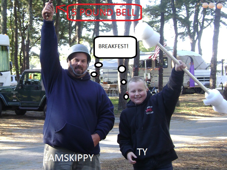 Im a fat guy i can cook it comes natural, i will help out as well, and if you need someone to ring a dinner bell let me know, i have experience ... SEE THE PROOF BELOW - Andys son and me, ringing the breakfast bell after a night of fishing.
