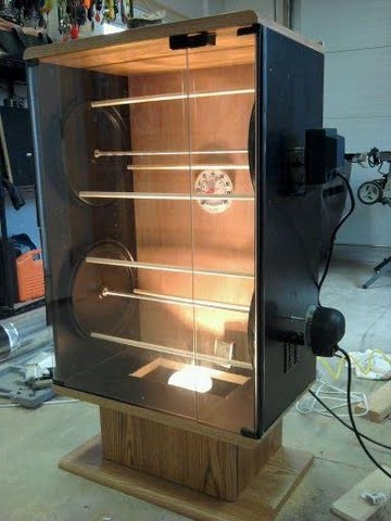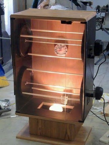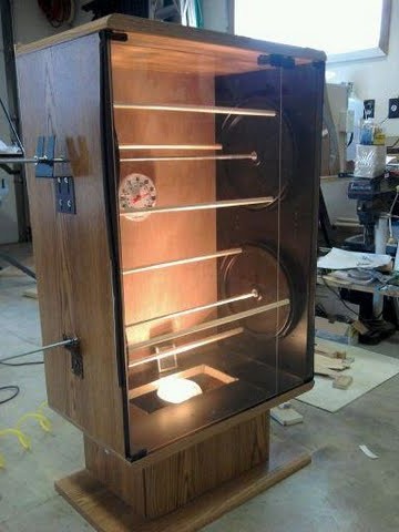 Thanks guys! Anybody have experience with heat bulbs? I was thinking of using a 125 or 250 watt bulb, that should get it cooking! Is there a fire danger? I was going to line the bulb opening with heavy duty tinfoil as a heat shield? Question I have is that much heat close to the lower wheel will hit those baits pretty hard. Can I use a piece of aluminum over the light slot opening that will diffuse the direct heat, but still allow it to heat the box?