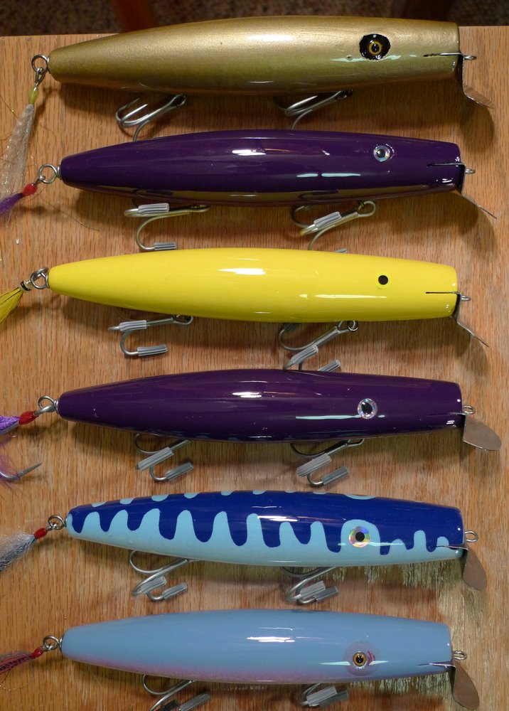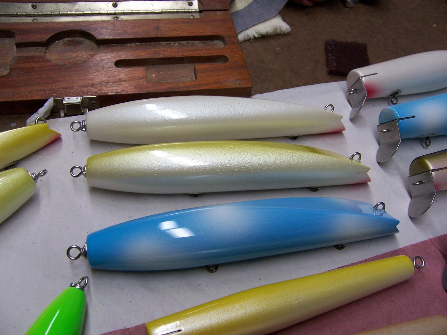 Got a chance to test swim the new ones on thurs., so it was a long painting session yesterday. Large and med. Goo Goo's to paint today and start epoxy tonight. Pikie's are 7" & 8", BM Dannies lg. and med. Also have to turn a Nike for Chris (BT) and a Pikester.