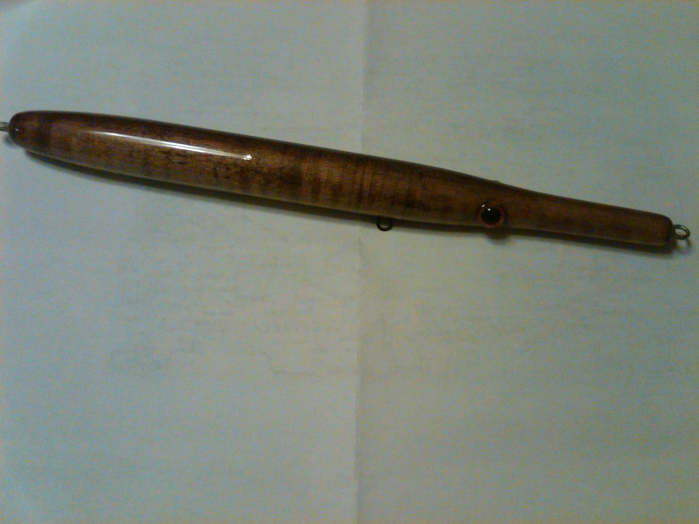 here is my completed 7" eelie with the aluminium wire shortie pieces along the lateral line. I stained it with blue water soluble wood dye... i trued to get a dappled effect on the top which actually came out great. we shall see if it fishes well... fun making this one