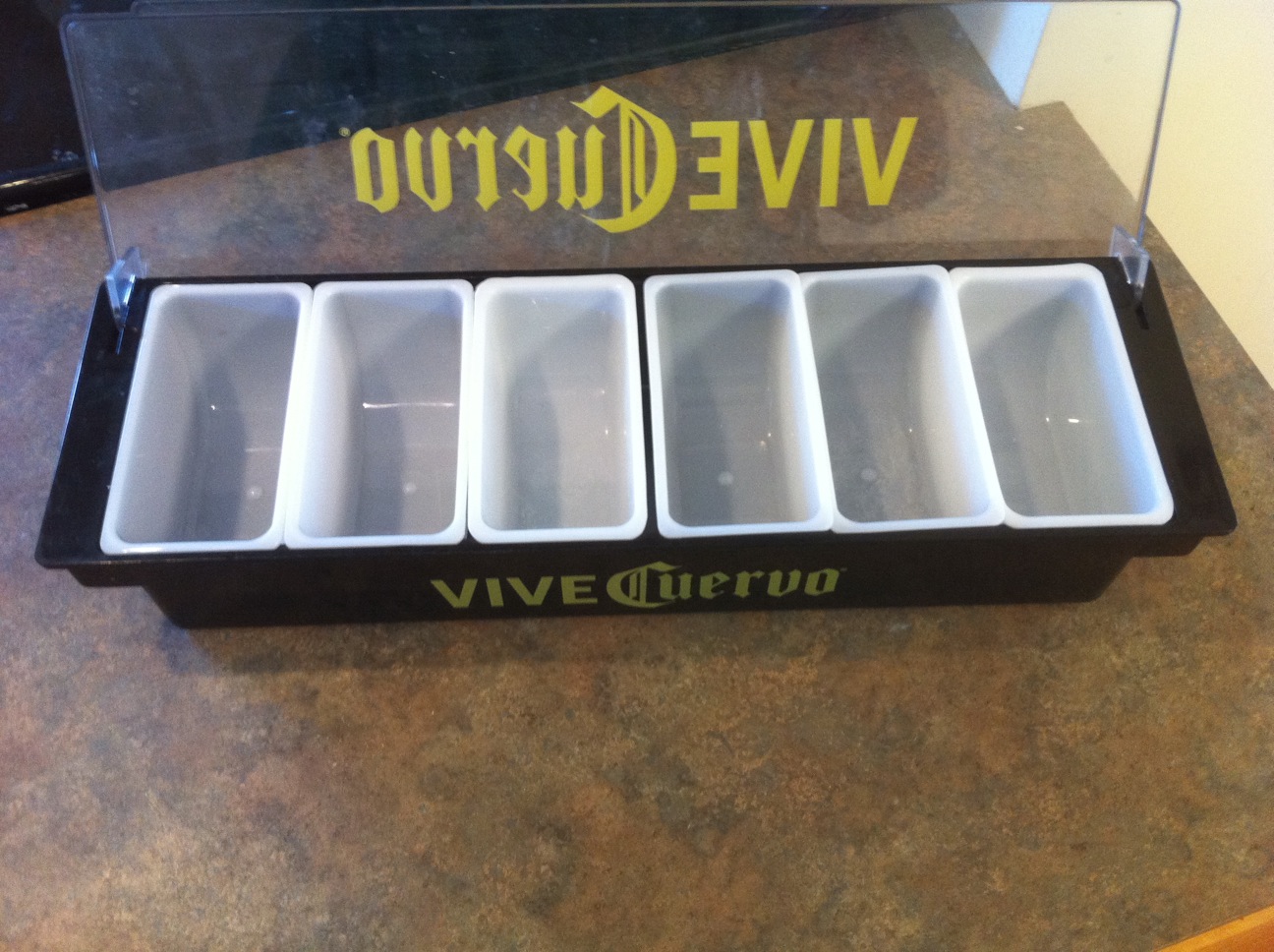 Jose Cuervo Fruit Tray, 6 compartments, flip lid, 19.5" x 6". I use mine for plug building to hold weights, grommets, etc. Also have another one in the shed with nuts and bolts.