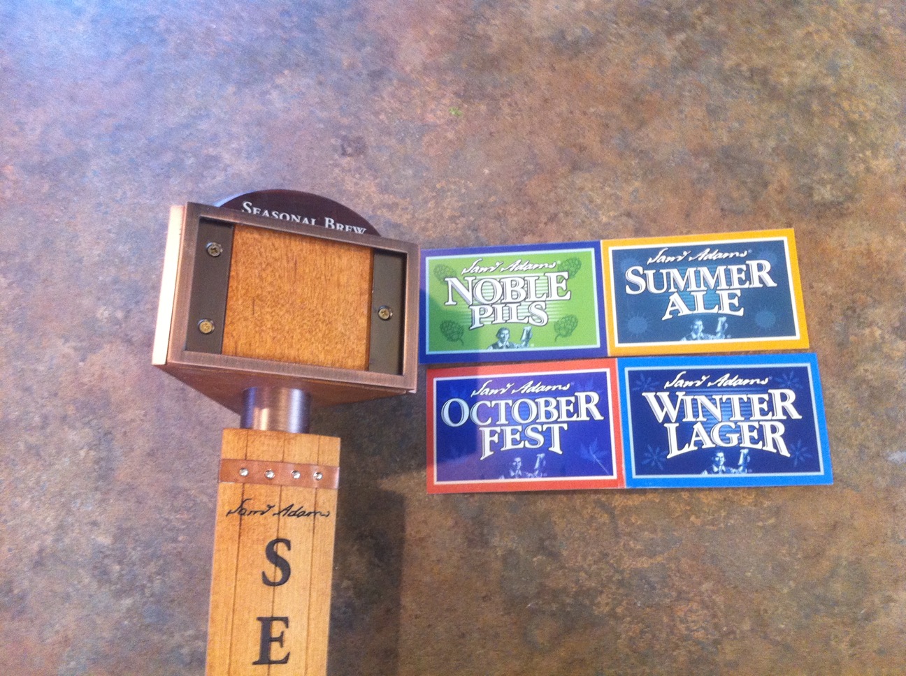 Sam Adams Seasonal tap handle, has 3 removeable inserts telling you what seasonal beer it is, you could easily make your own logo and put it in the handle.