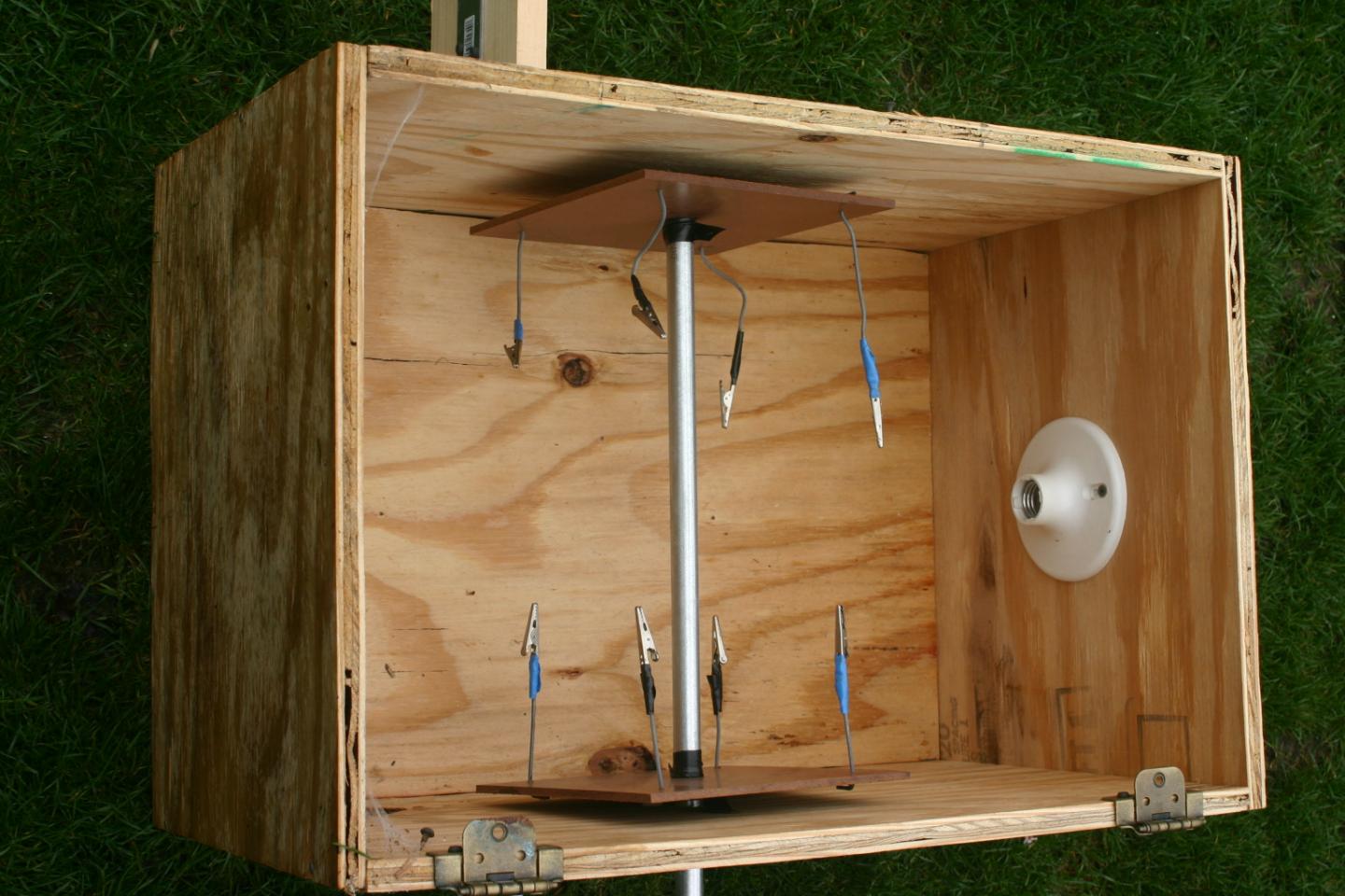 This is a plug spinner I made a few years ago. Its a plywood box with a piece of conduit pipe going through it and some aligator clips to hold the plugs. I used a rod turning motor to spin the rod. It also has a light fixture in it.