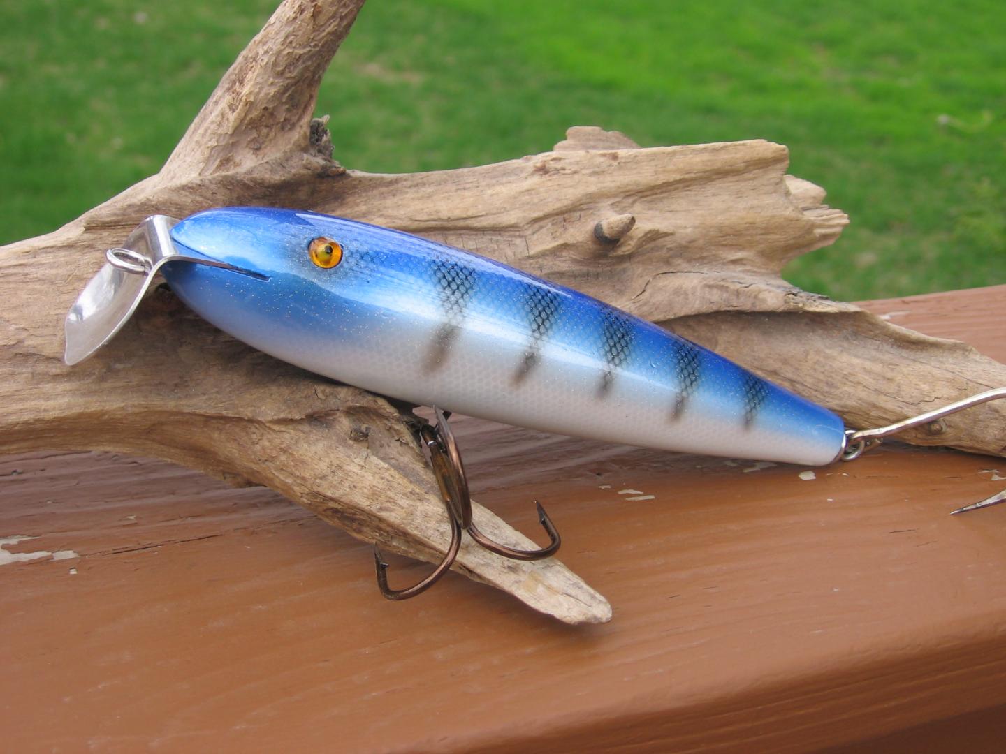 Hey guy's, I just finished up a few before our Musky season opens next weekend,(Southern portion of the state). The first one is a round nose surfster made from WRC, it is 6" and 2oz. The next one is a handcarved ,detailed and foiled buzz type bait at 5" and just shy of 2oz.