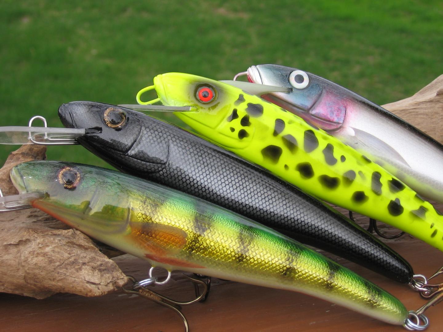 The next ones are resin baits that I have molded. The first one is a jitterbug style, jointed 7" long and 2.5oz painted in a nice black with rainbow pearl flake added to the clear coat. The other ones are my Musky Minnow with lip variations and different color schemes. They are 7" and 2oz. Hope you like them, I can't wait to throw that Jitterbug at low light conditions! Good luck this year, and tight lines to all.