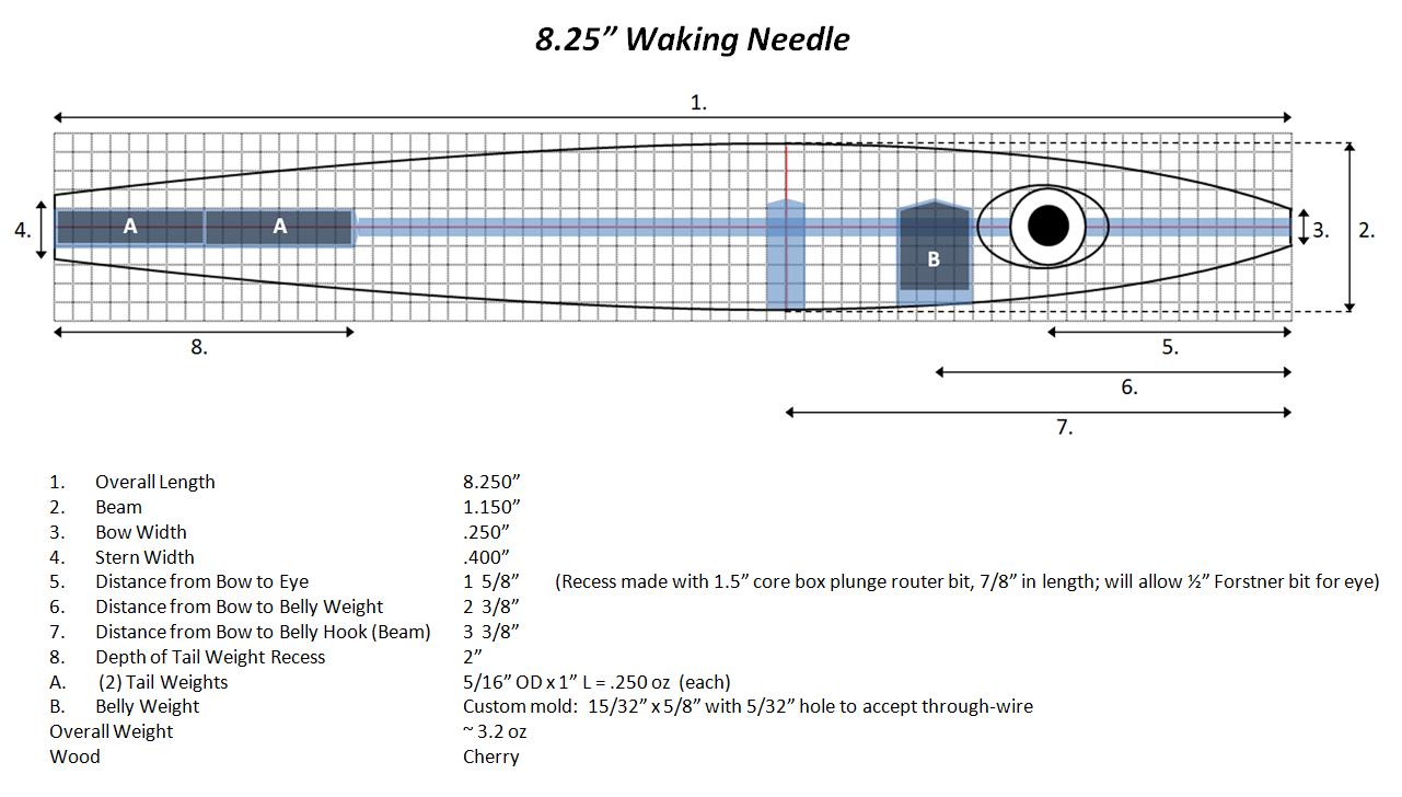 All needles have approx .45 oz slug of lead about 1" forward of the "hip" of the lure. Roughly the same weight is in the rear. For the black, wired needle it's a centered weight; the others have (2) .225 oz slugs at about 1.5" and 1.875" from the rear.