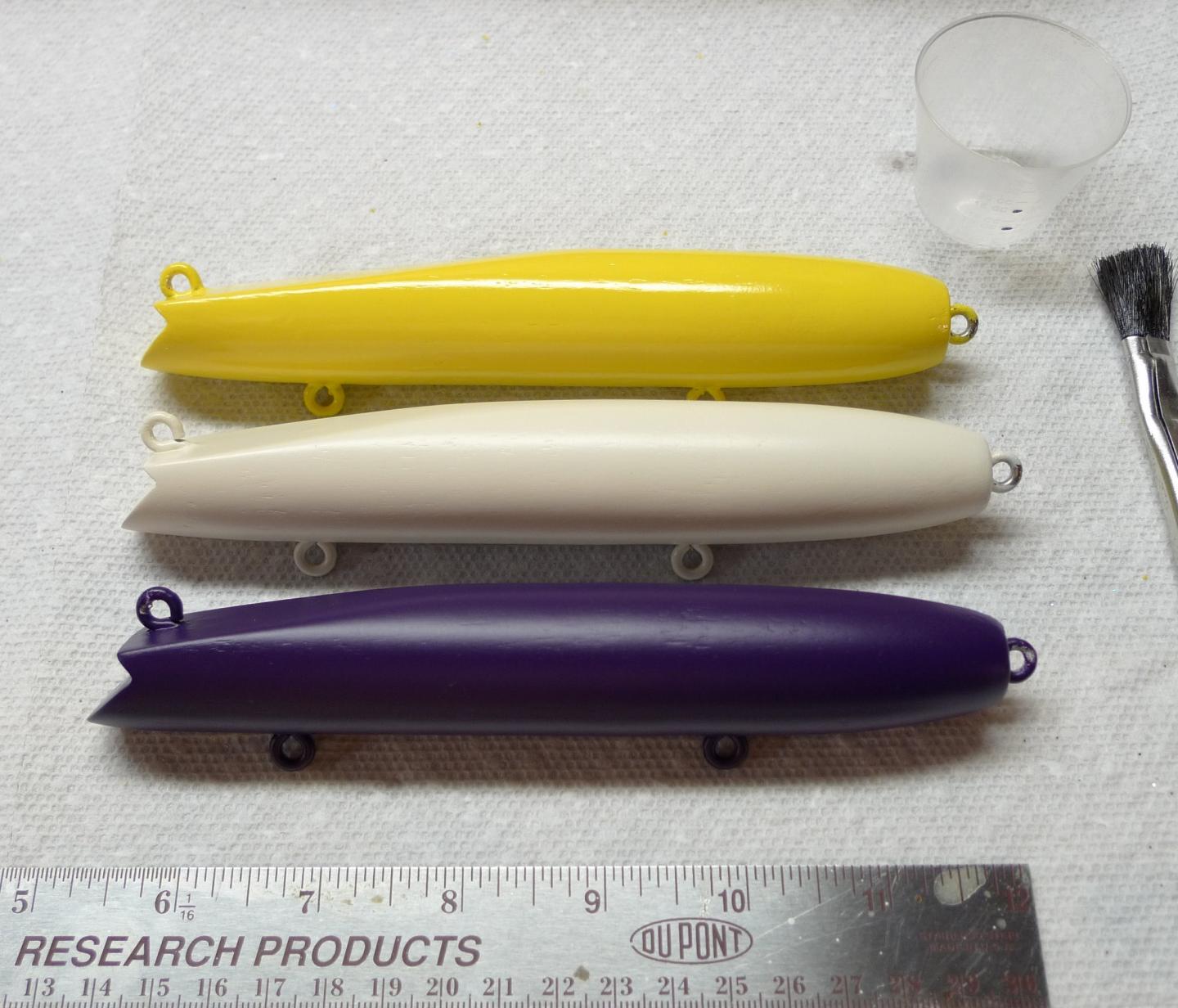 Made 3 of the Screw eye 6 and 5/8 inch darters according to one of the articles Frech published in the Fisherman ... decided to stick to SS screweyes instead of thru wiring... made them in yellow birch... I decided to move the stern belly hook back just aft of the wt position so 4/0s will not marry while casting