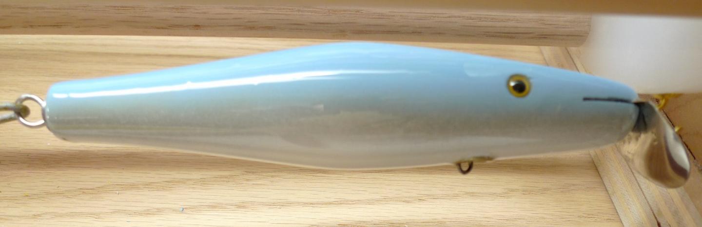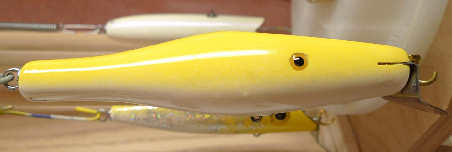 Then a yellow Rinehart Jinx Surfcaster with sparkles. Playing with the weighting to get it to swim subsurface