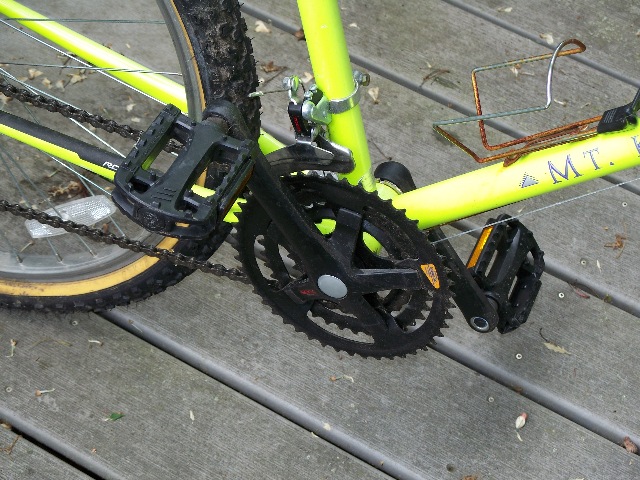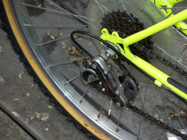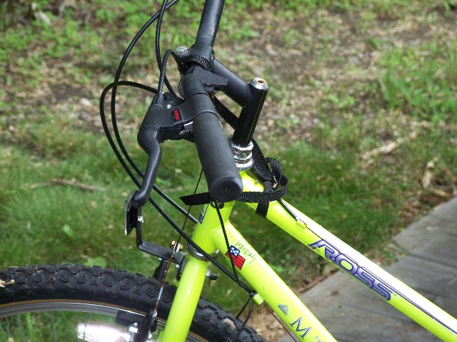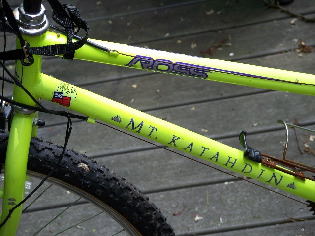 This was my deceased sister's bike. I looked it up and apparently Ross was a high end mountain bike (which doesn't surprise me). This has the bar halfway between a "girls Bike" and "boy's bike" Not straight across , not all the way down. Its not new but my guess is this bike was riden less than 10 times. It has some scratches but mostly its really nice. Its yellow and says Mt Katahdin on it. Looked it up on the net and saw a MSRP of $399. It has 26 X 1.9 nubby tires. Shimano 70 GS shifters.