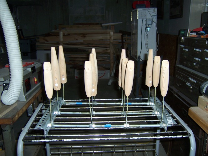 the dip rack is composed of thin angle iron ( bought pre drilled at Lowes) and 3/8-16 threaded rod...short lengths of wire ( suspended ceiling hanger wire) are sandwiched between a pair of 3/8 -16 nuts on the threaded rod... a very slight bend in the wire near the end adds enough tension to keep the plug from sliding up the wire when inserted into the sealer...