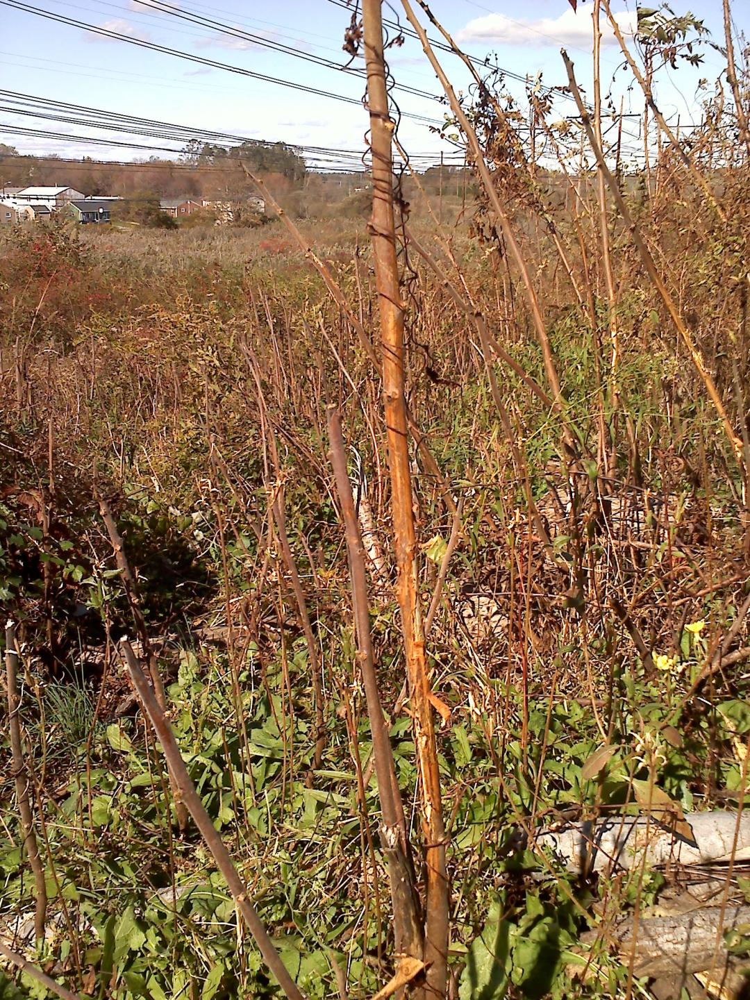 I just cut the grass and went down back to dump the bagger and there was a small buck having a field day on the overgrowth at the edge of the power lines. Couldn't get the phone out fast enough once I spotted him. I did get these pics of his handy work on the saplings. Looks like I have to dig out the groung blind.