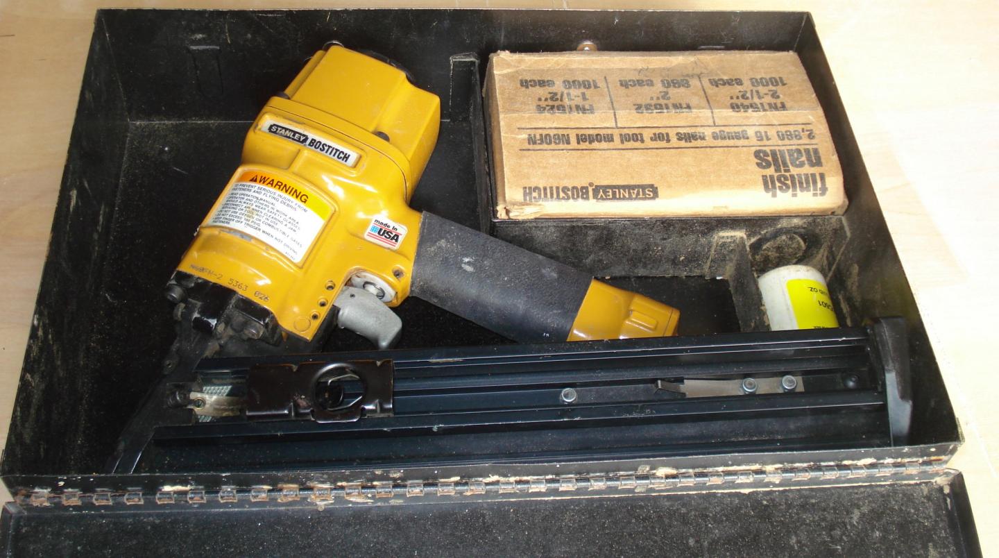 Stanley Bostitch 2 1/2" 15 ga..finish angle nail gun. Original metal case. Excellent contions. $100.+$8 shipping. have some Misc. nails to go with it.