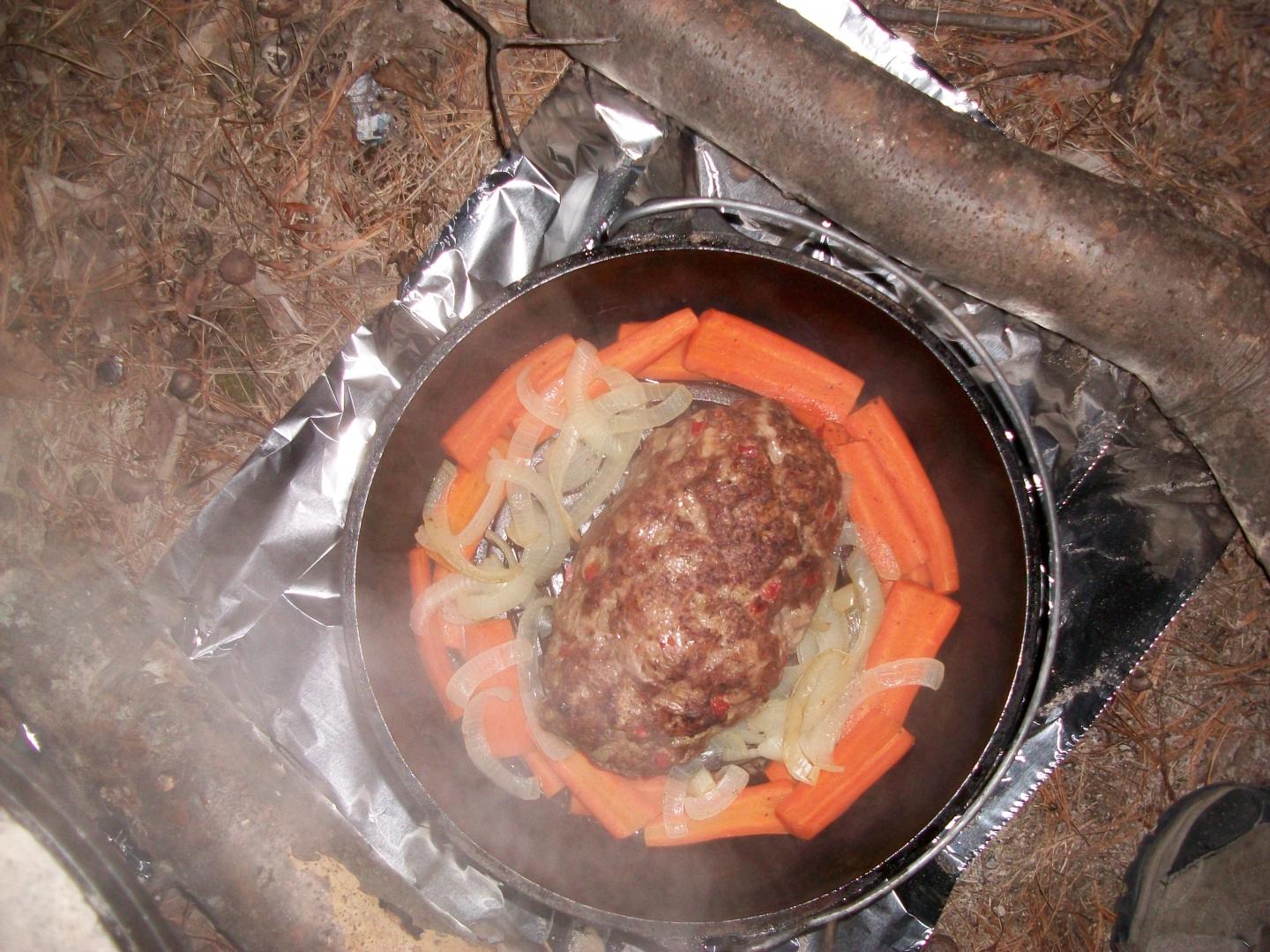Fired up the meatloaf in a Dutch Oven w/ the Carrots and some onions. Prepped the Stove for the potatoes and the Gravy.