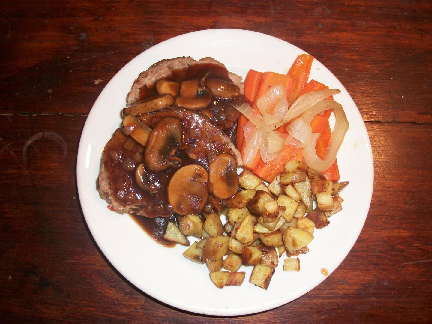 Had some quality time up at the Boy Scout camp this weekend and made up a nice meal.....A Nice Meatloaf Dinner w/ Mushroom/onion gravy, Pan-fried Potatoes, and Carrots.