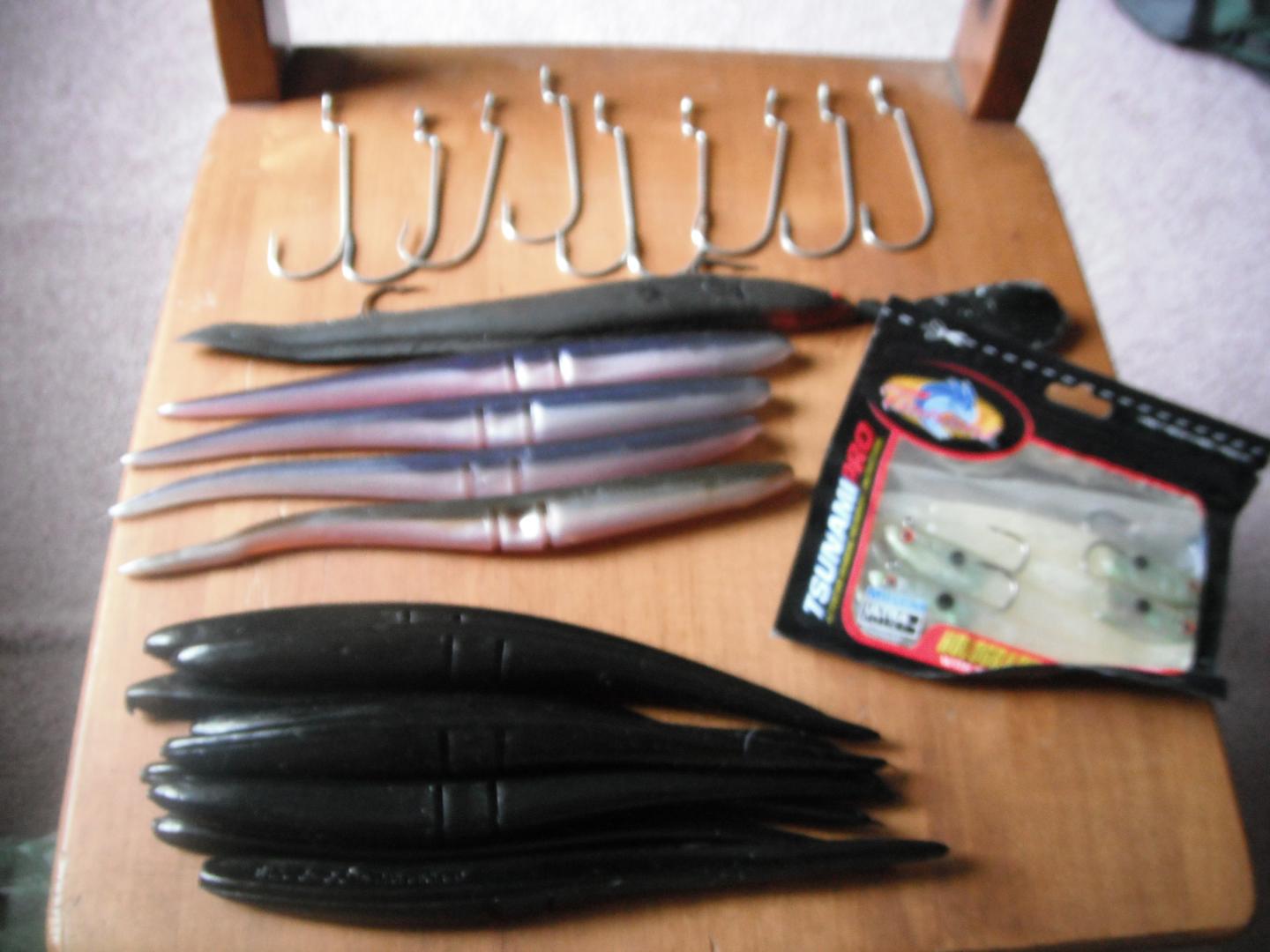 9 black sluggos, 4 other ones, 9 sluggo hook, Spro rigged eel, and pack of swim shads. $30 shipped.