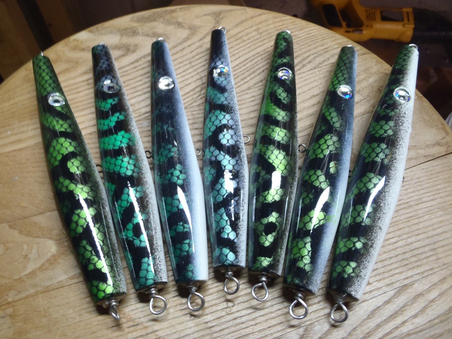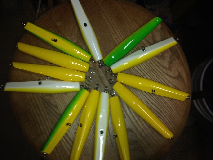 The plugs on the ends had some sadness and fell in my epoxy spinner and the finish is looking sad. Buzz said he would test them for me though, thanks Phil!!! I plan on signing the others for Pat, Ben and Ty, to trade for other lures at Plugfest. With these there are some more small and large pencils for the group to trade also.