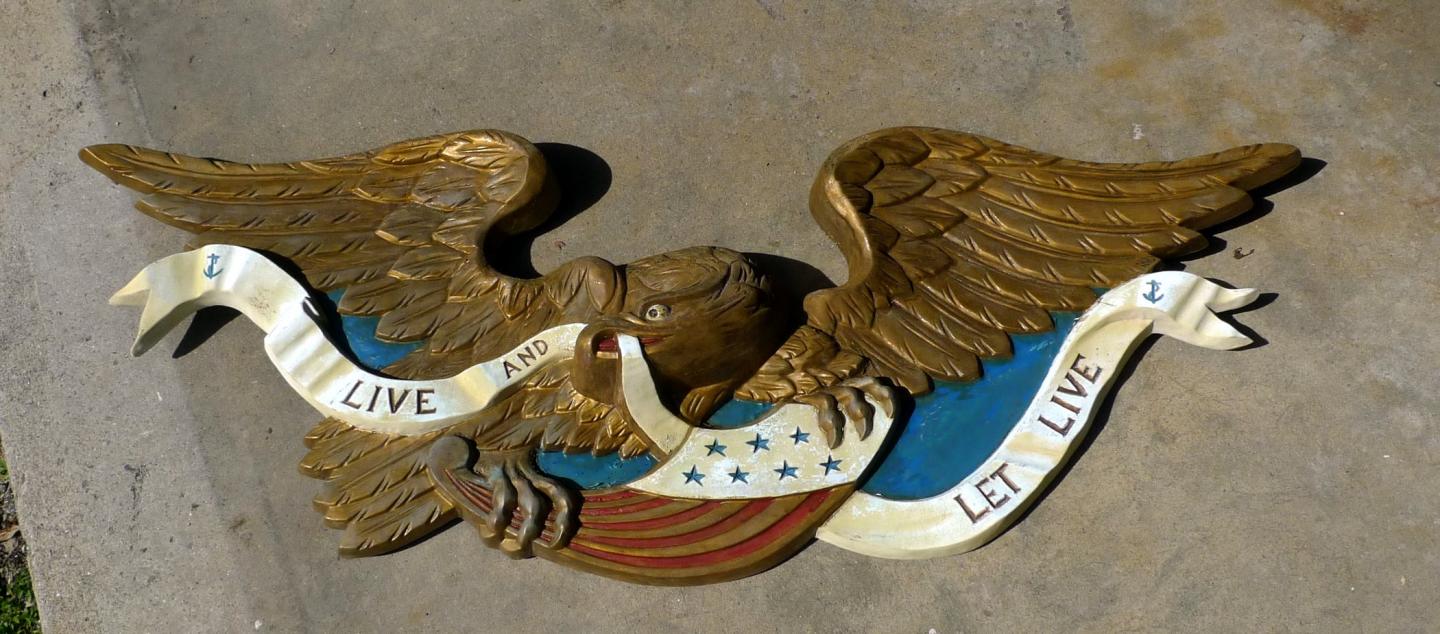 My Mom and Dad had it on every home (moved several times) since I was about 12 yrs old... it was bought on the Cape and was most recently on my Mom'place in Yarmouthport ... she gave it to me and it has been on my garage for about a year... With fresh paint it would be stunning... it is a classic... on the back in margic marker it says Flying Cloud which was a Clipper Ship... maybe it was a copy of the transom eagle from the Flying Cloud?