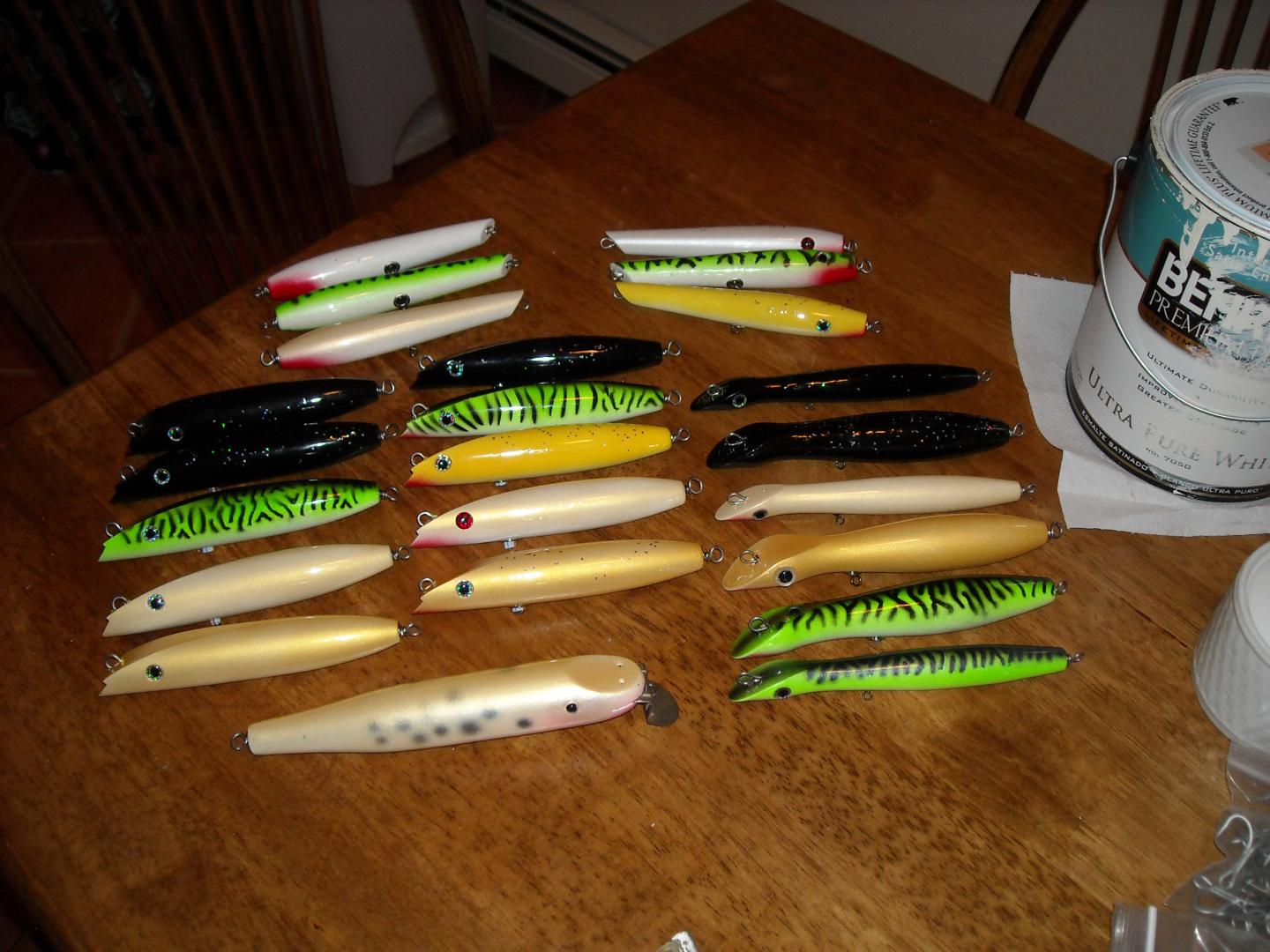 Darters on the left are maple and the only ones I really needed to replace from last year, center darters are lighter (made of ayc and weighted), the slope headed on the right are more experiments (big ones are basswood and small are maple). The pencils are pine. I had a real hard time drilling them straight, I won't use that again on plugs that need a tail weight.