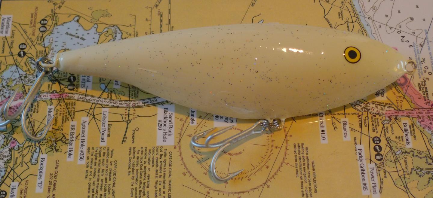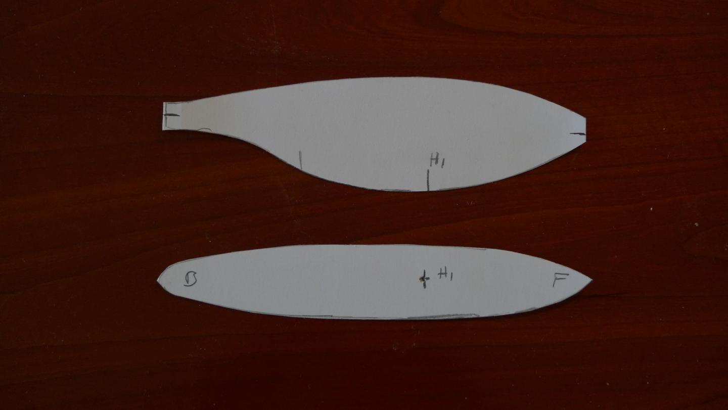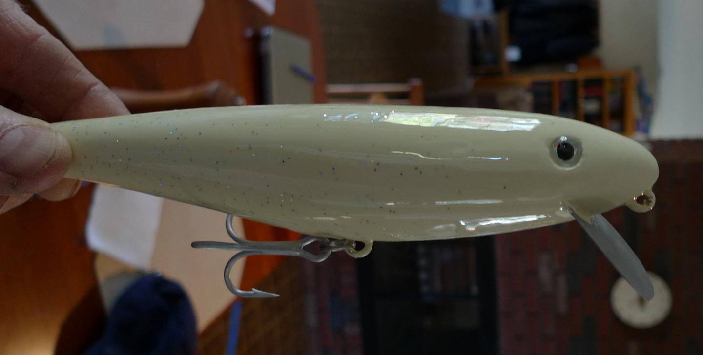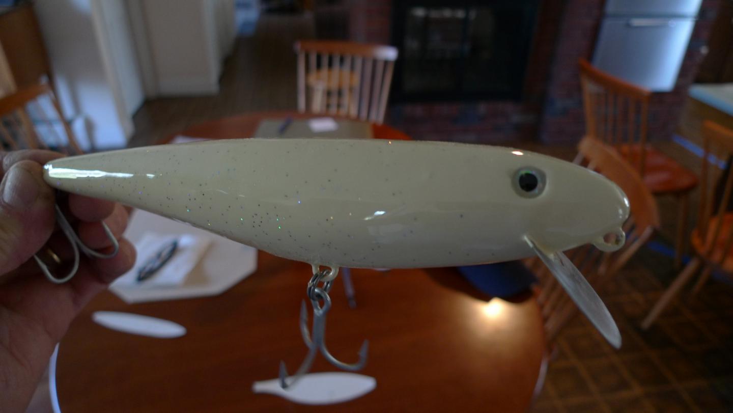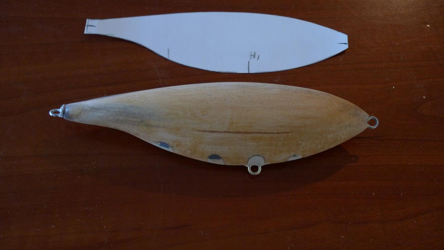 I traced a 7.5" plastic stick shad in both side and vertical profiles... see pic, then used the tape method and my bandsaw to rough out the shape. I drilled the weight cavities before bandsawing... I use brass sinker eyes set in epoxy for the belly hook attachment and thru drill before bandsawing as well.