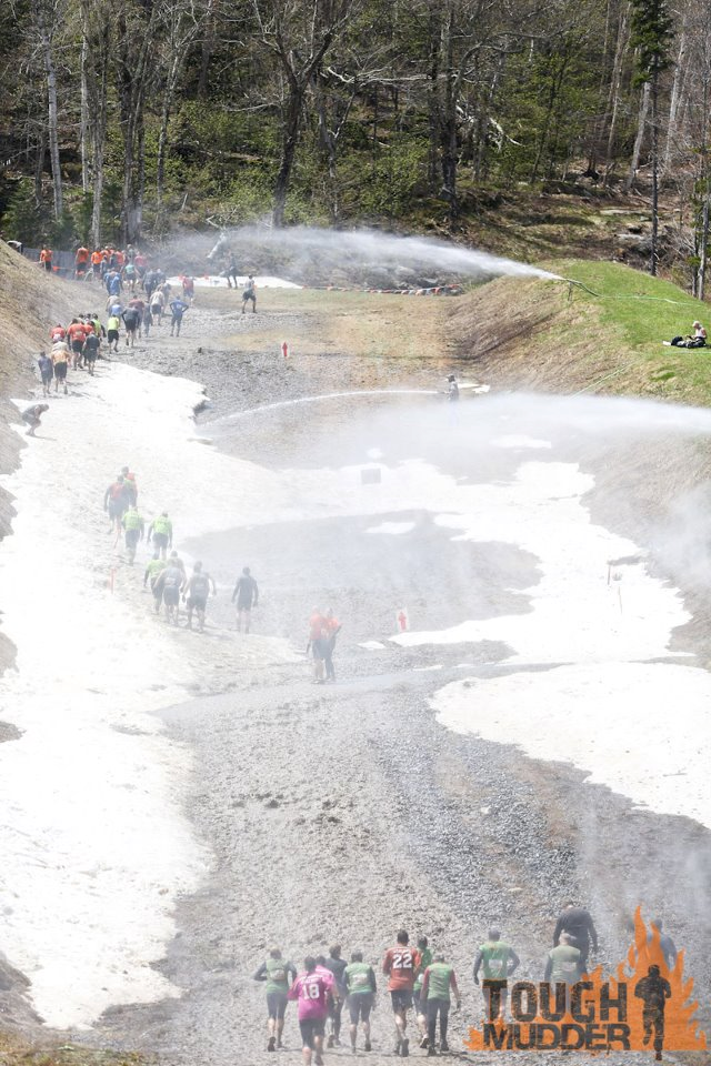 Thankfully, the “arctic enema” came early in the race as people would have probably been leaving on stretchers or worse given the cold shock you encounter here. Scaling the platform up to a huge dumpster filled with ice and sub 30 degree water, I didn’t give much thought to the difficulty of this obstacle until I leapt into the water, surfaced, and realized I could no longer breathe. I quickly tried to gain control of my breathing but had a real tough time doing so. I pulled my body up on the side for a second to get my torso out of the frigid water, barely caught my breath, and then plunged my entire body back under and emerged on the other side of the wooden dam which forces you to go under water in order to complete the obstacle. Coming up on the other side of the dam I could only feel the weight of ice pushing down on me as this thing is packed to the gills with ice and feels like frozen quicksand. Making for the exit side, another guy ahead of me extended his hand out to help me get out, but I was too panicked to grab it and relied on some adrenaline to get me out. Upon exiting, I blurted out a quick “WTF” and started laughing my ass off while I scaled down off the obstacle and began a light jog back up the mountain. This turned out to be the toughest obstacle for many, perhaps due to the fact its frigid water in addition to being the first water obstacle you encounter. I spent the next 30-40 minutes really humping it up and down the mountain while building some body heat back up and trying to get my diaphragm back in its proper place so I could breathe normally again.