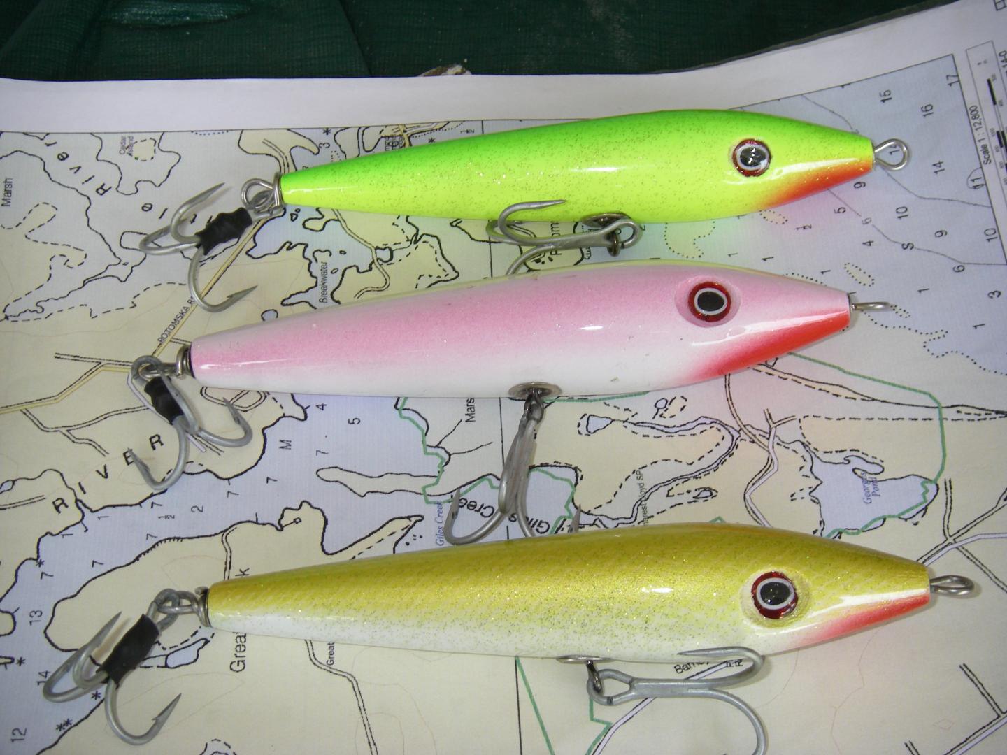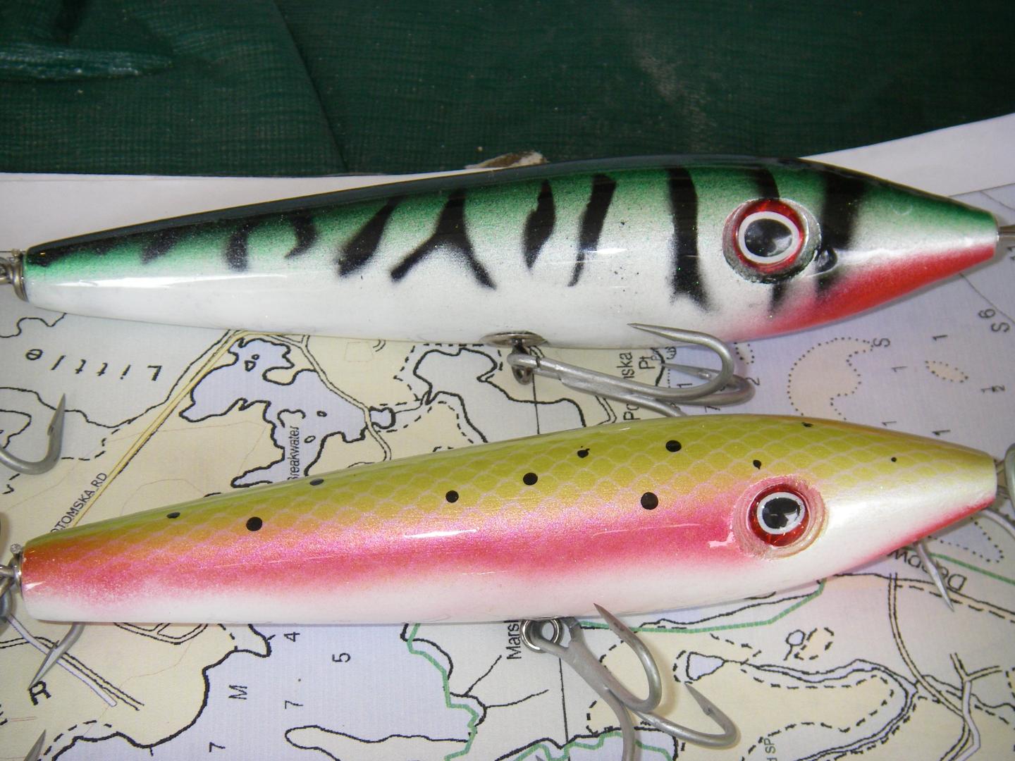 I wanted to post these pictures of some ballarinas that I made this winter. These are the first plugs i have posted. I wanted some spook type plugs that would cast better than the balarina copy that I made from the most recent fisherman series (Dave Andersons not the professor). I used the copy machine at work to blow up my original template. I like the way the plugs turned out but am not happy with the clear coat. I used etex but will try rod coat next. Charlie G.