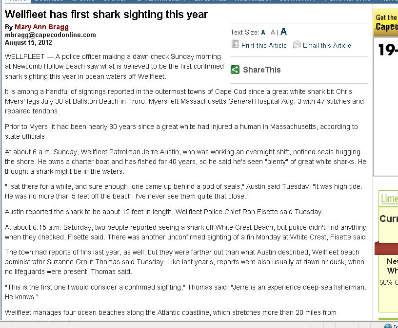 Reporting these "new sightings" is all kind of silly. If sharks have been spotted off the Race, Backside and a solid presence in Chatham, any nitwit should be able to draw a line from point A to point B and think "hmmm... white sharks must travel through here."