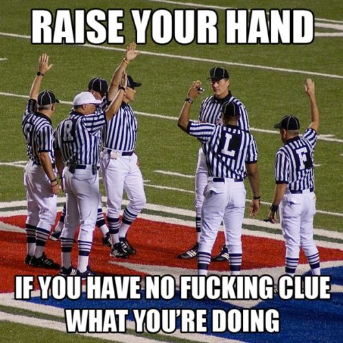 When you have two refs signalling different signs on the same play, and they stand and look at the players on the ground like they had just opened a bear carcass and were trying to find it's arsehole, that really pathetic!!!!!