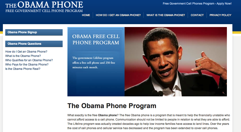 I'm pretty confident that Obama and his team were very happy to have sites like these (maybe even negotiated) telling people that Obama was giving them free phones for the last 4 years, there have been countless pop ups I've noticed during that time touting that Obama is providing this or that and it has clearly worked...there's been an explosion in Government provided "stuff" and it will continue if we allow it...it's a mentality that they have fostered so you really have no argument complaining about it now that it has apparently become a negative for him....