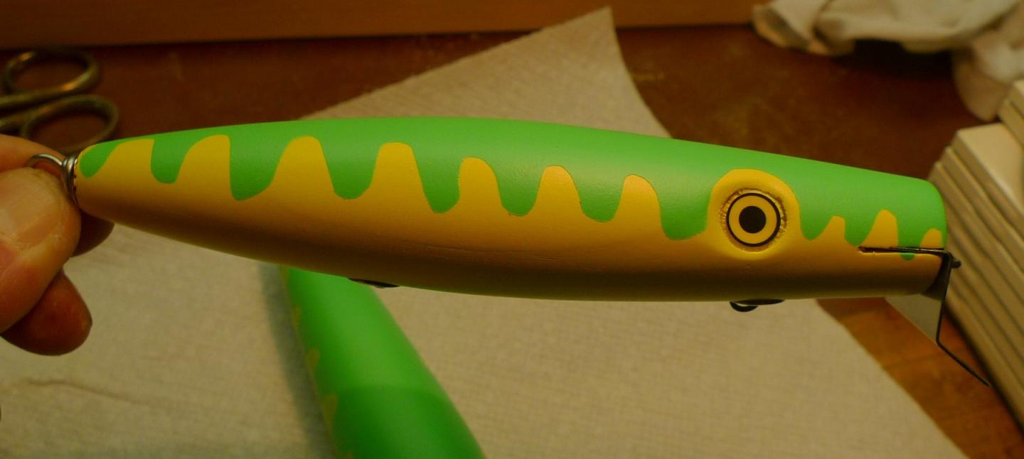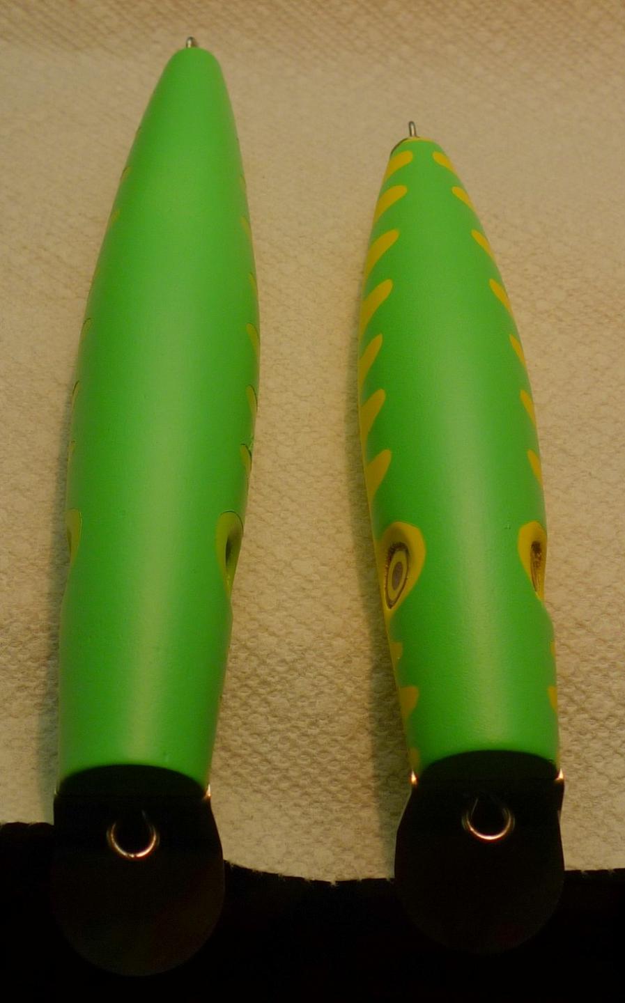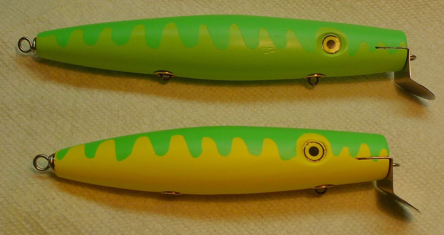 I just made a Senior and Junior Surface swimmer for a few fishing friends. I cut both blue painting tape masks at the same time.. they are applied to a piece of wax paper... one on each side so I get a nice symmetrical scallop pattern when cut with small fly tying scissors.. Both of these are made with lefty 2 high slot lips. I think the original pine senior surface swimmer had a mid slot lip... both will be rigged with cut 3/0s and tail flags