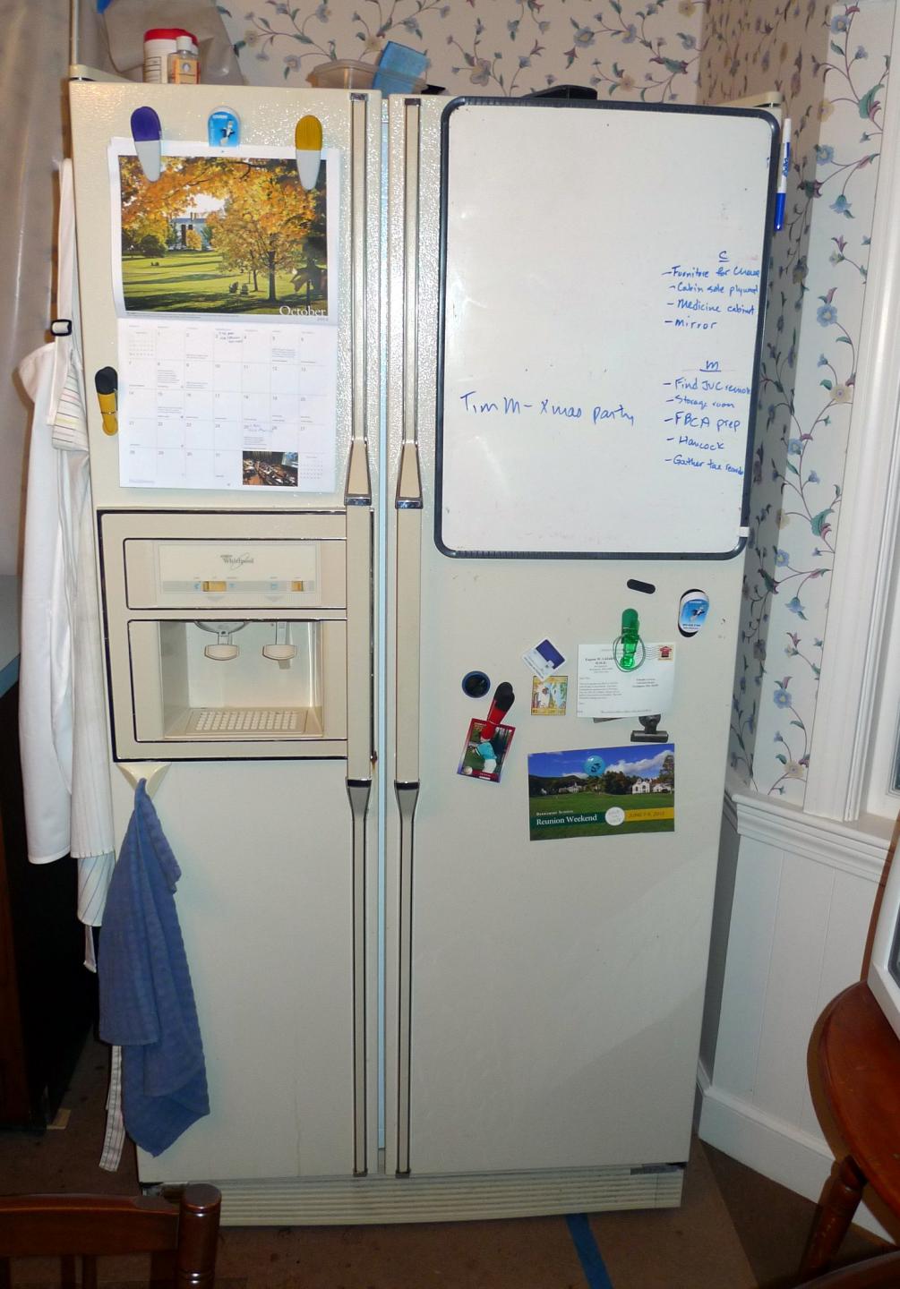 Side by side model with ice and cold water thru the freezer door. Works perfectly...ice maker replaced 2 yrs ago. Color is almond..