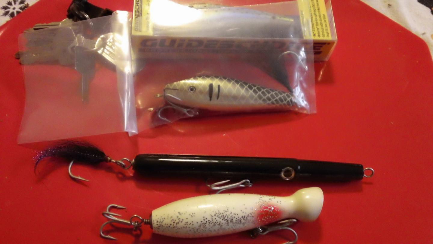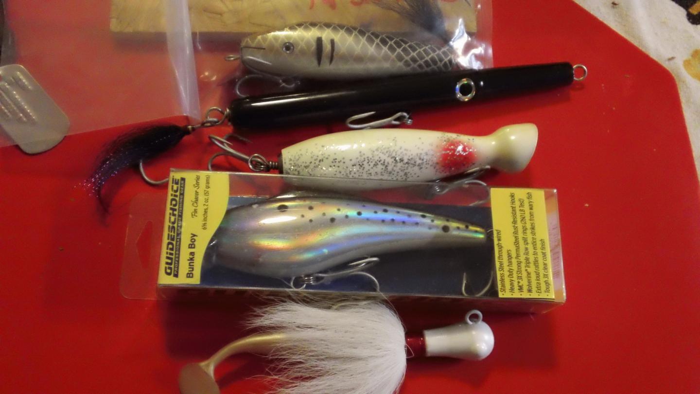 I can probably come up with more stuff if I dig around some more, if you fish the canal I have a jig I could throw in. Let me know if this stuff works or I can throw in more probably? guides choice bunka boy, choopy cowboy jr., 2 oz. needle is a hab's knockoff I made, tsunami polaris popper. Everything rigged with vmc hooks
