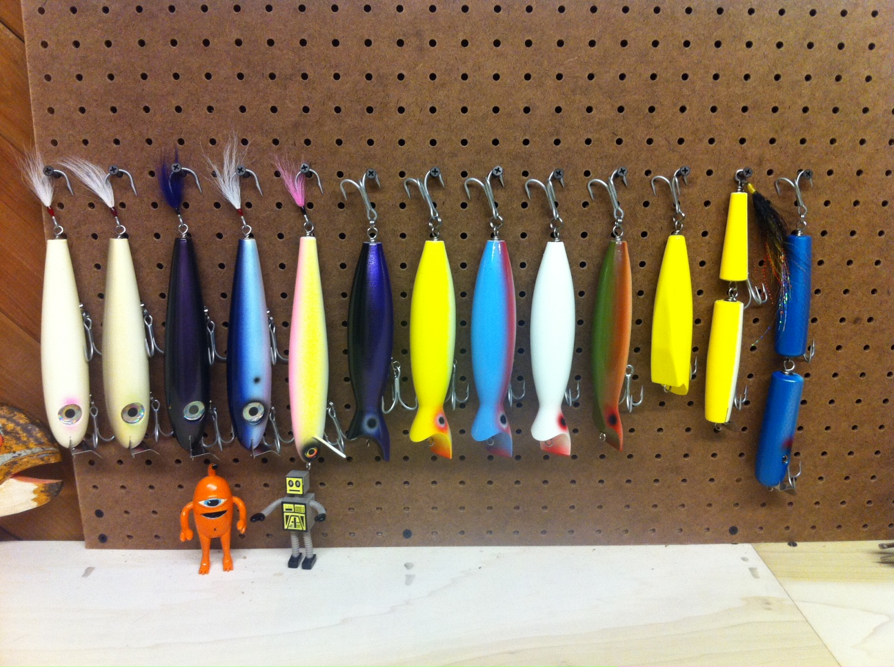 on the wall a sheet of 8x4 peg board for hanging rods, assorted "nicer" plugs that havent seen water yet and reels and tools.