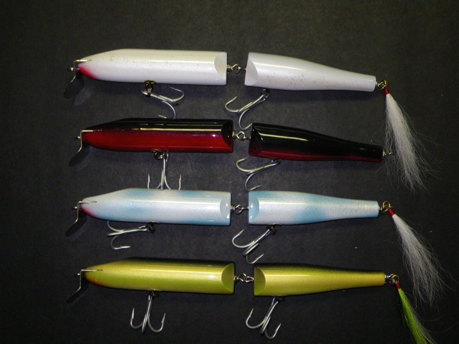 Although people talk about using the giant jointed plug on the outer cape I don't think many guys fished them much. They are a pain to carry, hard to cast without conventional stuff, and their action is under-whelming (although the pull in surf might perk them up). I built some versions of the BM/Pichney clone but have not done well with them. Here are some of them.