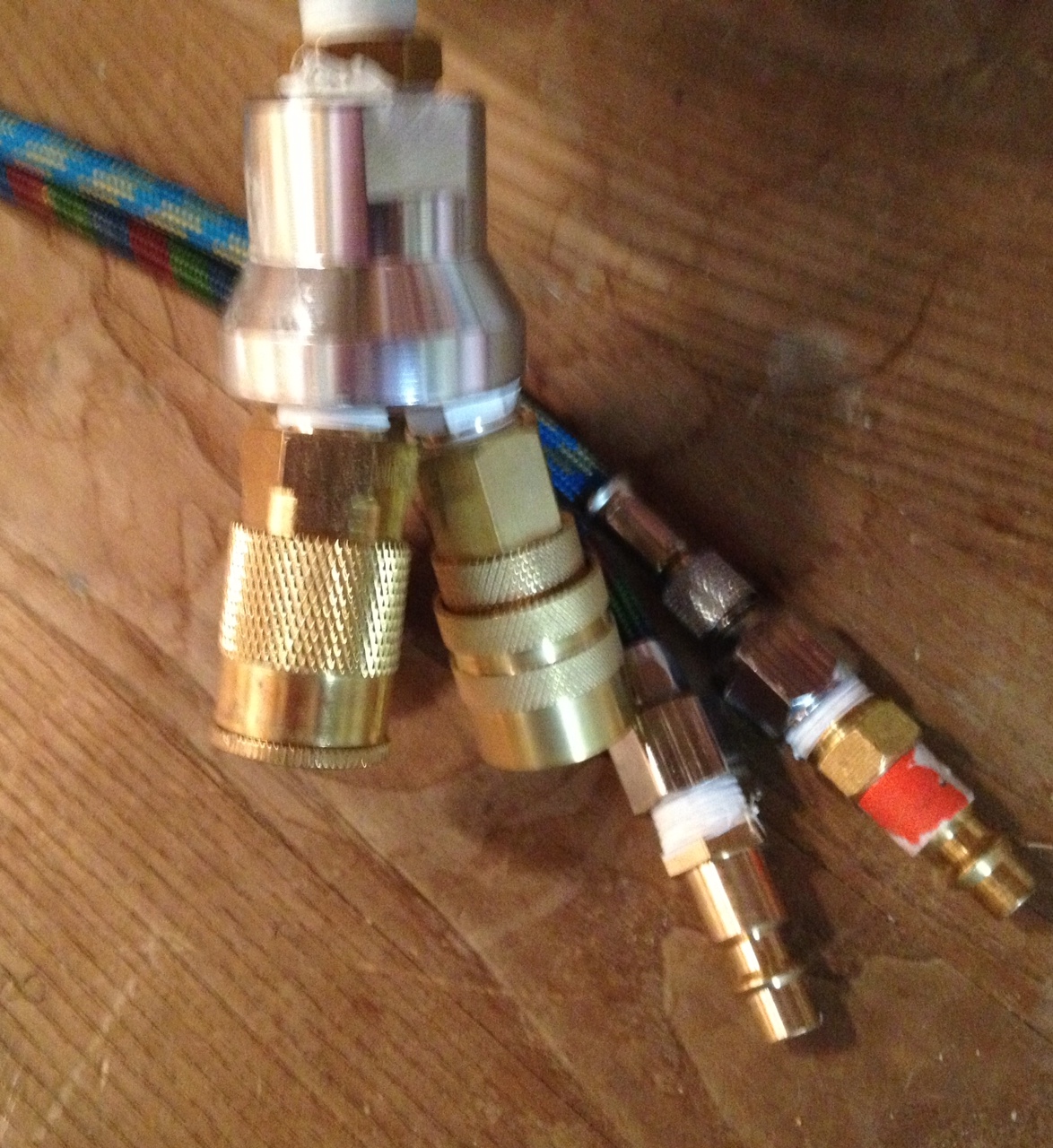 One of the changes I've made to my airbrush station is I like to use 3 airbrushes at the same time. I picked up everything at Lowes. Quick disconnects makes it east to swap out brushes without using wrenches and you can unplug one and still use the compressor. I needed a 3/8 to 1/4" reducing bushing for my connection to my compressor. Use teflon tape at all of the threaded connections.