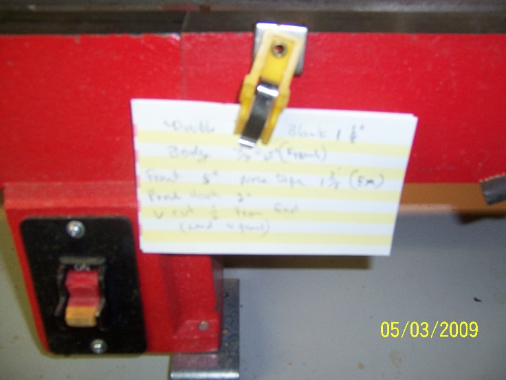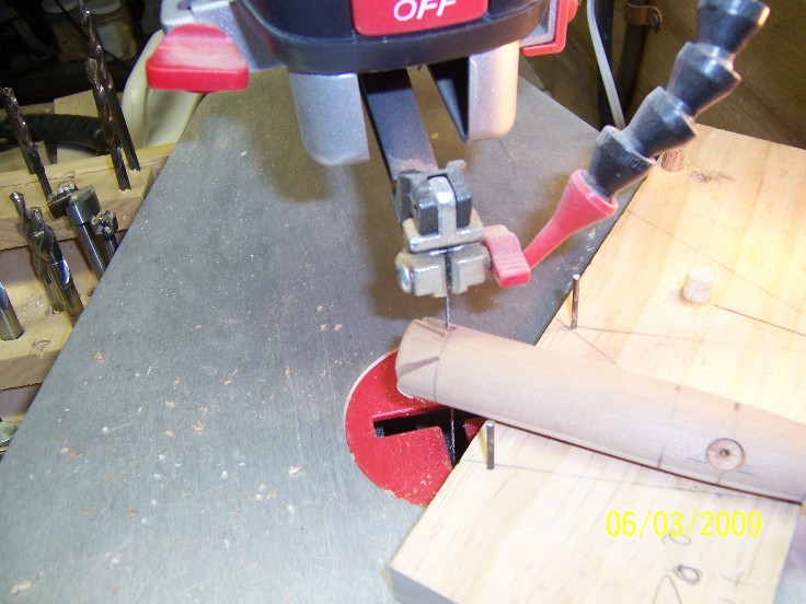 the first picture is of the jig I made specificlay for making this plug,it's been modified a few times but it serves several funtions, a dowel centerd 7/16" near the front holds the plug in place as I cut the lip slot, because the pikie 1 lip is so thin, I use the scroll saw instead of the table top band saw to cut this slot....