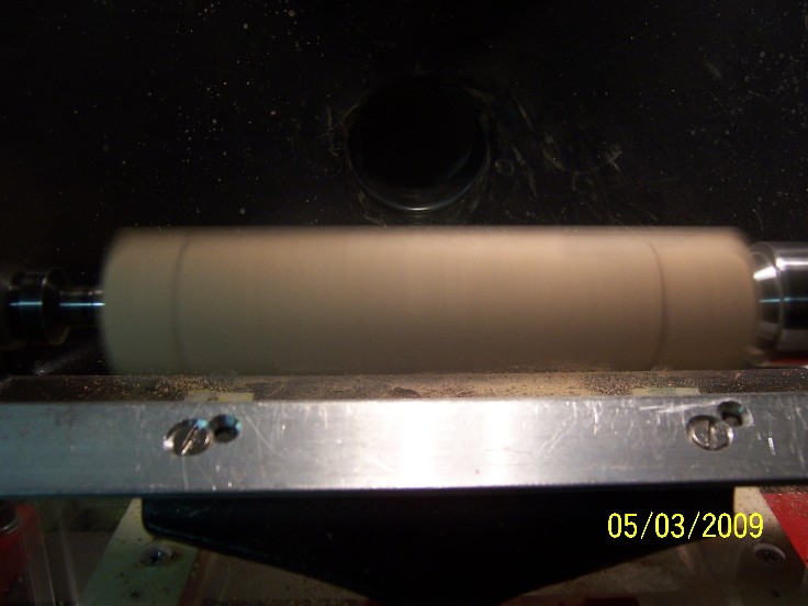 once the blank is on the lathe, make two marks on one of the flats, 6" appart to mark the front half of the plug ( beggining and end) this will be repeated with the secnd piece for the rear half, be sure to leave the square ends, you will need them.. once the blank is marked, even though you only marked one flat, you will be able to see the ghost image and using your roughing gouge, turn the blank to a round cylinder that will be 7/8" in diameter when it's sanded, so leave a little extra... a word of caution.... use SHARP tools, becase of the difference in wood densities, dull tools are a bad omen... for safety, please wear a full face shield... eye goggles dont help when a blank or errant hunk of wood whacks you in the cheek...