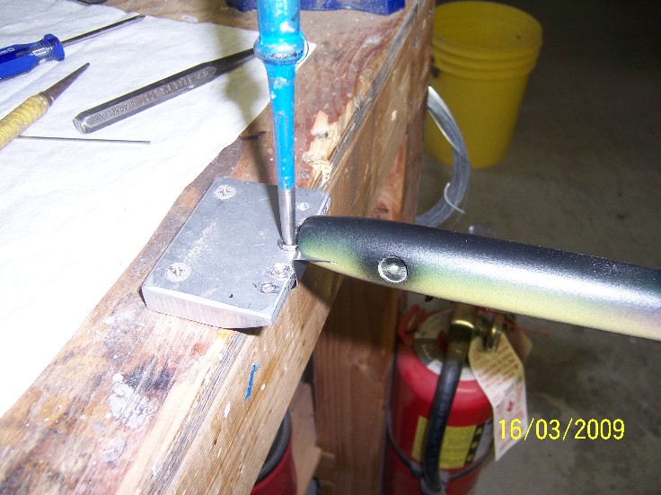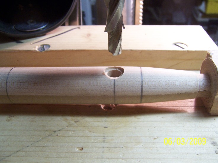 proceed to your drill prss and drill your belly holes, they should extend approx. half way through the plug, I use a step( multidiameter) drill for this, so it's a one shot deal, I had the size written down but somewhere misplaced it... if anyone is iterested i can give you the size, it fits the .341 belly gromet perfectly...