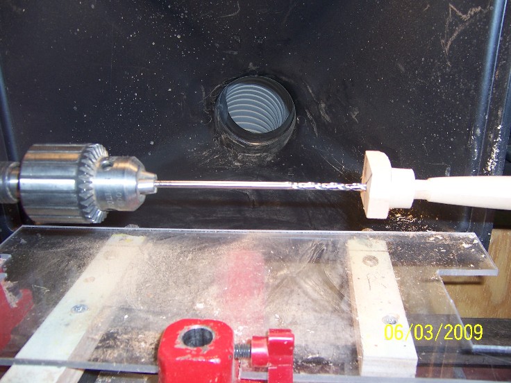 Now return to your lathe ( use your drill press if you want) for this process, I use a 5/32" drill bit, drilling from the rear of the front half, drill through until the drill comes through the belly hole... stop her, you will finish the front latter... repeat with the rear, you can go all the way through here...
