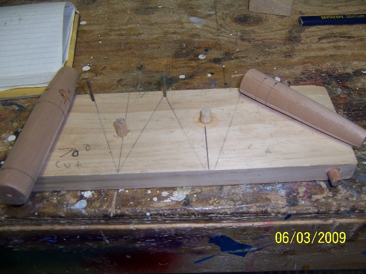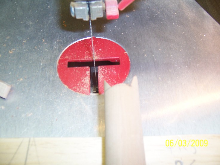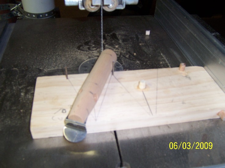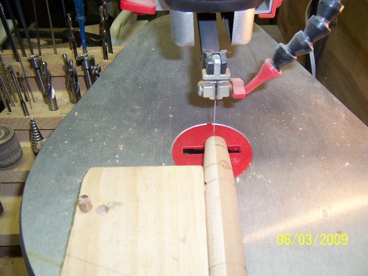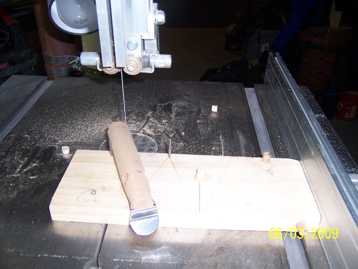 so, with you fence set up on your band saw, the plug on the jig, make you 70 degree cut, move the fence, put the plug on the opposite pin and cut the other side, I leave approx 1/8" on each edge, I sometime make a few straight cuts on the band saw before moving to the scroll saw ( a coping saw also can be used) I then clean out ( rough) the cut with the scroll saw, afterwards, I finish the slot with a small sanding drum on a demel tool, be sure to round out the edges, or they will be brittle ( the mape gives them strength this was another reason I went to the maple laminate) and not hold the epoxy well...