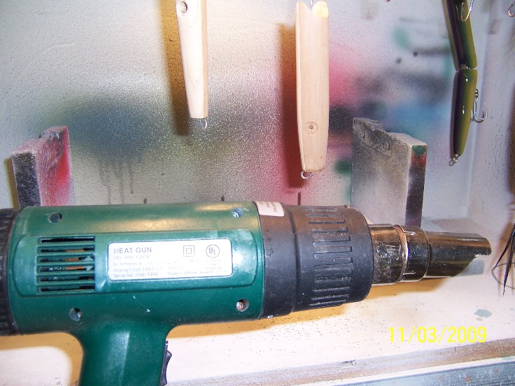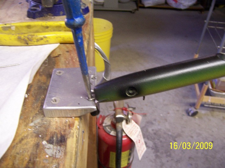 once each plug is coated, I like to look at each plug as it spins under different light and agles, checking for "holidays" or bare spots, last year, I started "flaming" each plug using a small propane torch, the carbon dioxide ( just like when you exhale on them) breaks the tiny gas bubbles, thsi is not entirely nessary, most of the bubbles will disapear on their own, but by flaming the plug ( 4-5" away or you WILL catch them on fire) it gives the finish a glass like look, also if you should discover a bad spot when the epoxy first starts to thicken, a light application of heat will alow you to repair the spot... this can be done for about the first hour.. it depends on the temp in the room ( or spinner)