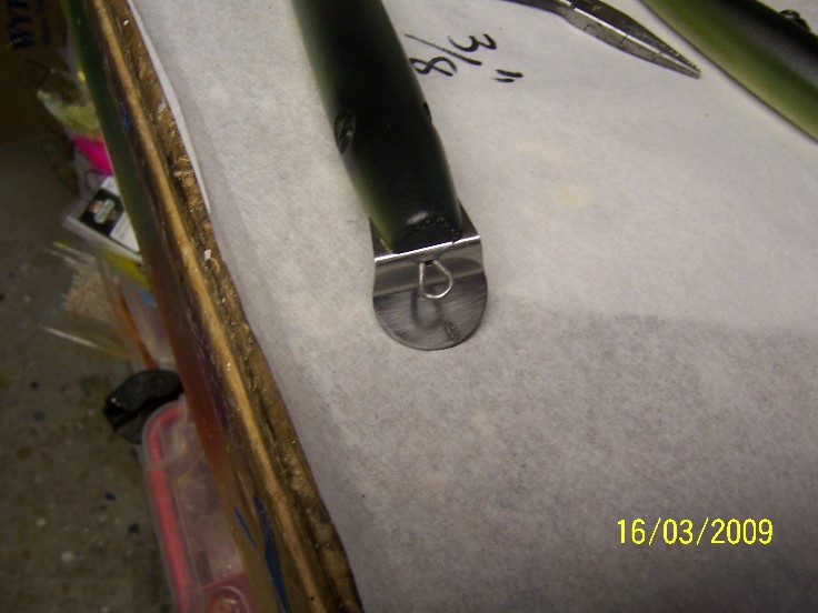 select a length of anealed wire, install it into the body cavity( front half) with the preformed loop nestled in at the joint, so the loop is horizontal.... where it come out the nose, measure 3/8" and mark with a sharpie, this will be the center of your line pull...