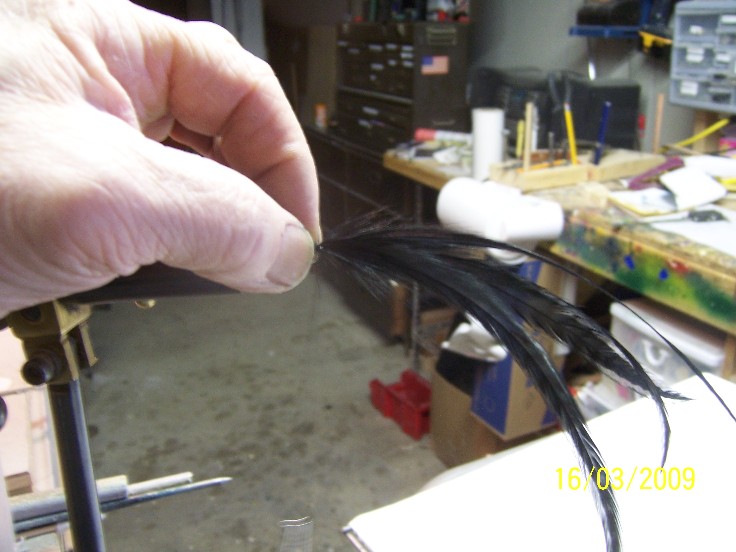 For the tail, long saddle hackles work best... prepare your "bone" and secure your thread, find 4 saddle hackles approx. the same length and strip the fuzzy fiber away from the base... in a simular manne to the deer hair, arrange two hackeles on each side, shiny side out, make two or three tight wraps around the stipped base of the hackles, secure with a half hitch... check that they are straiht and lay along the shank, once the are,trim the base of the hackle and wrap in a simular manner to the bucktail ,making a nice taperd finish.. secure and coat...