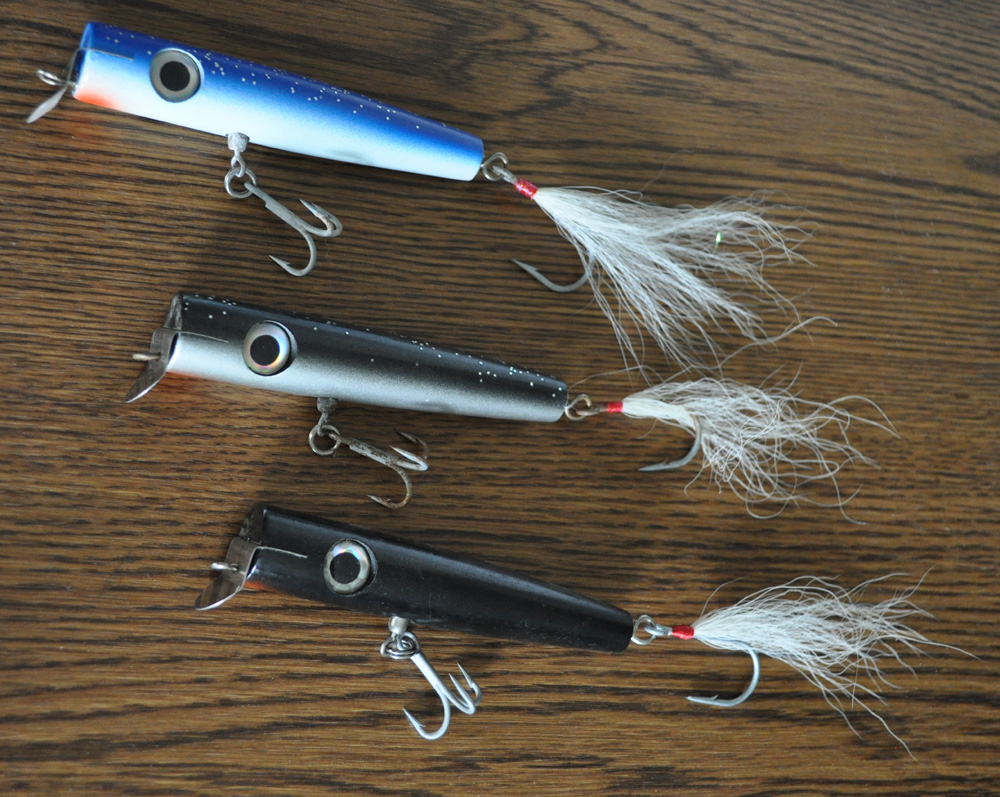 The top two have been wet and could use new hooks but the plug bodies are in perfect shape. I think I have the right size VMC's so I'll throw some in. The black one on the bottom is new.