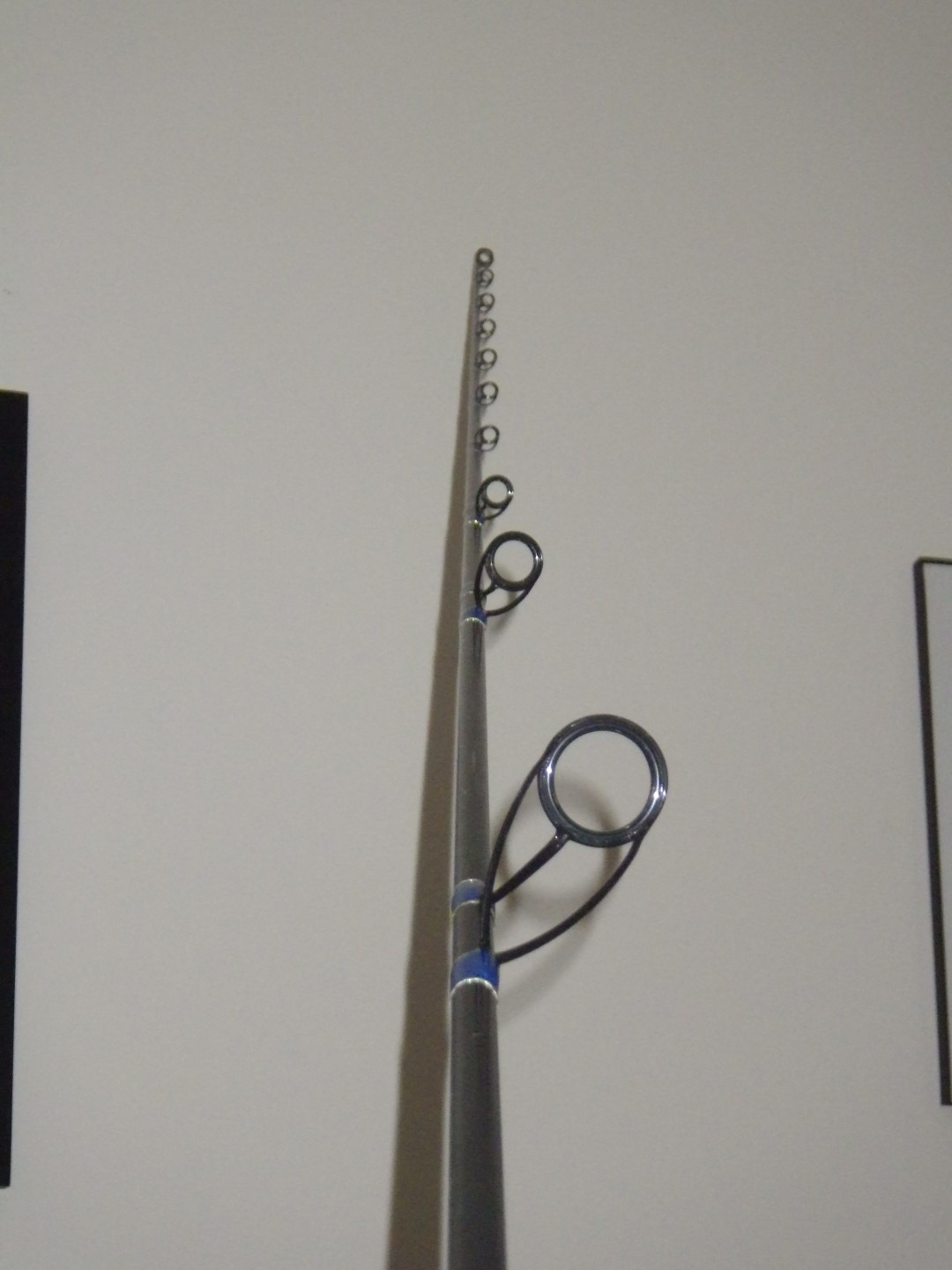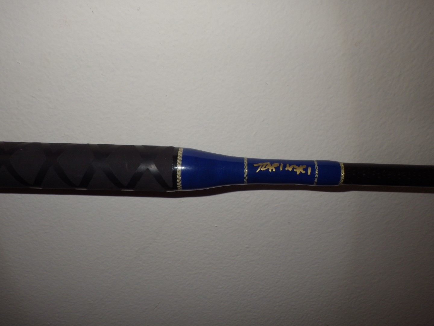Here are some pictures. The rear grip is 21 inches from butt cap to base of reel seat, the fore grip is 6.5 inches long. Guides are wrapped blue with holographic gold trim on the inside and gold/white tri-mar outside on the collector guides, tri-mar outside trim for the runners. The rod is signed T.LAPINSKI and 2013 in the short buttwrap and the reel seat is a DPS 18 with frosted silver hoods. I just gave the rod a good once-over and it could practically pass for brand new as there are very few signs of use.