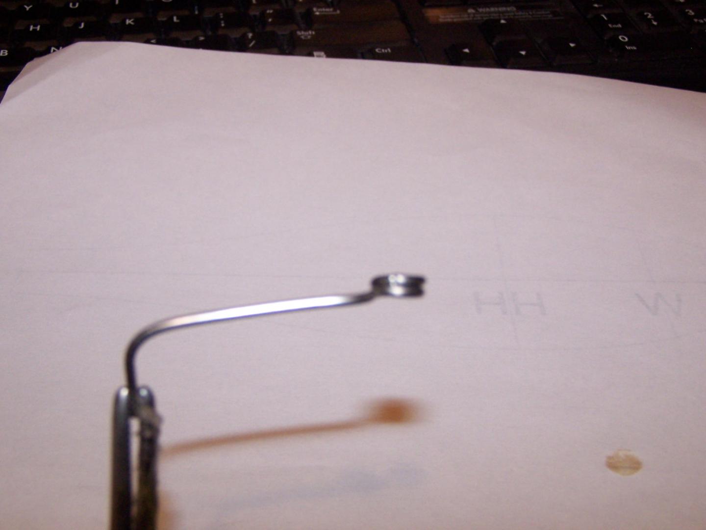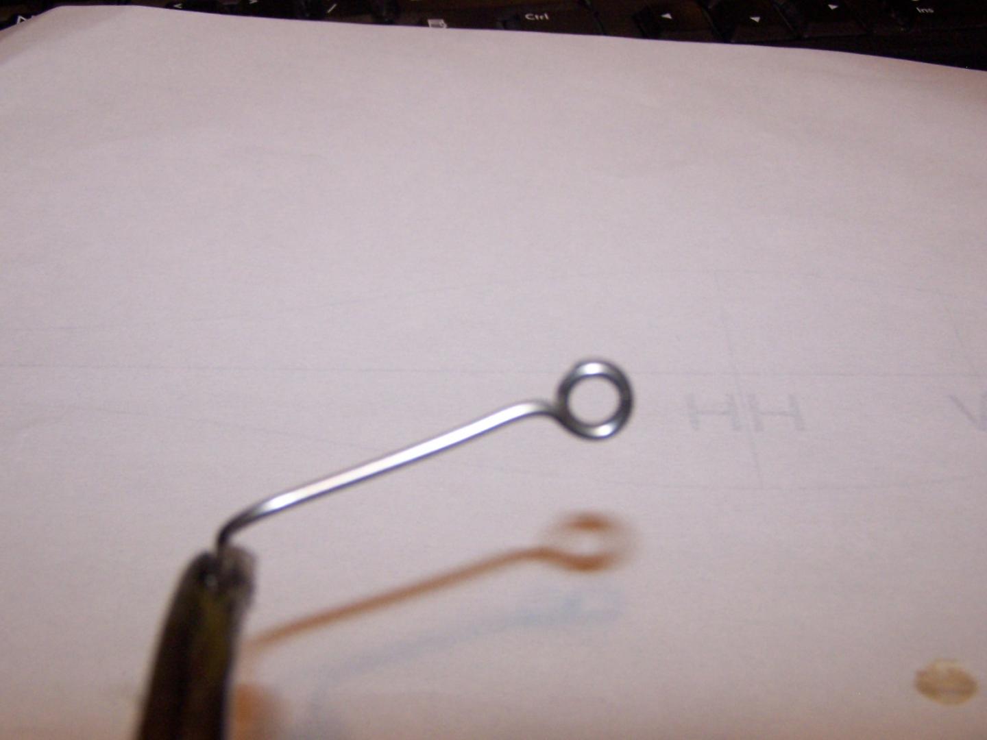 I am not sure how most guys do this, but when I read about other plug makers cutting off the hook from the shank of a perfectly good fishing hook, which cost about $.35 a piece on average I thought I would post how I do it. I take the leftover 308 wire we use for through-wiring our plugs, and I wrap that wire around the same screwdriver I use for making the tail of the plugs hook ready. I just wrap the wire around twice, no more, and leave the tag end about three inches. I put a bend in the tag end so I can put it in the fly vice. After mounting the tag on the back of the lure when its done I cut the excess wire from the now buck tailed tag, so the action of the tag isn"t impacted by the 308 wire. These three pics show the end product without the bucktail. Its cost free except for the bucktail and thread, and of course Sally Hanson clear fingernail polish. At least there is no $.35 hook involved. See below.