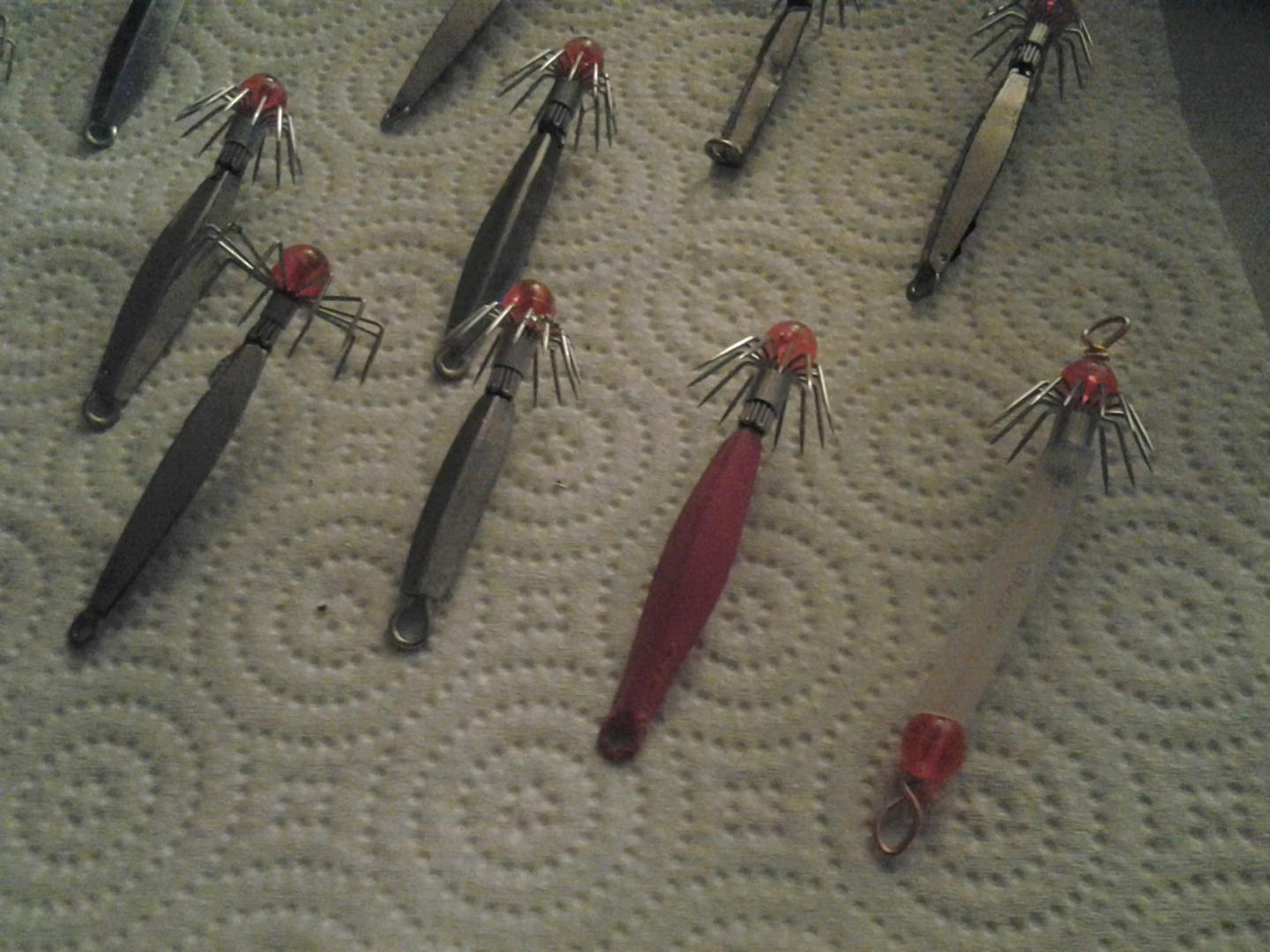 Let's hope this years squid fishing is better than last. I am putting together a bunch of jigs and should have them available in a few days. There are two basic styles, tube style and diamond jig style. The diamonds weigh between 1/2 & 3/4oz. And they are available in chrome or pink, and with small or large baskets. The tube style can be made with or without weight.