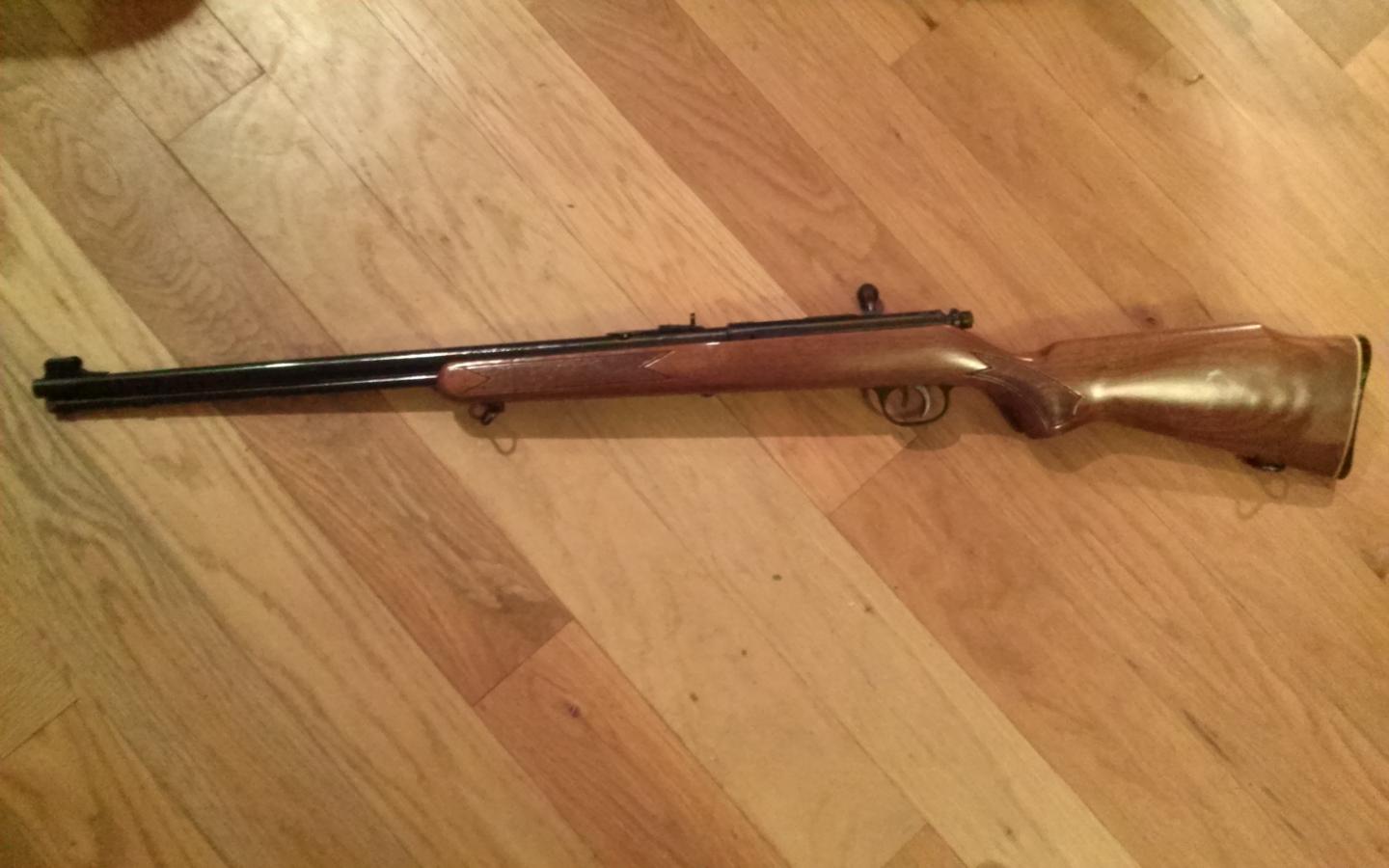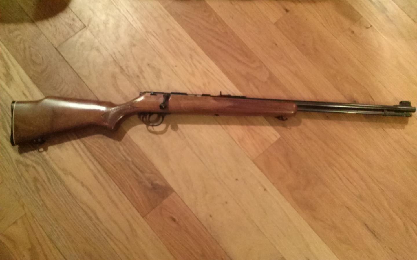 Marlin .22 tube fed. It is in pretty good condition and shoots fine. There is a white scuff on the butt stock but it should come off with minimal effort. $110